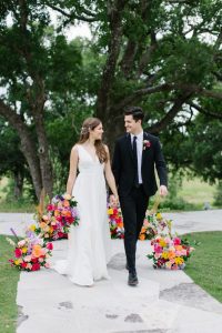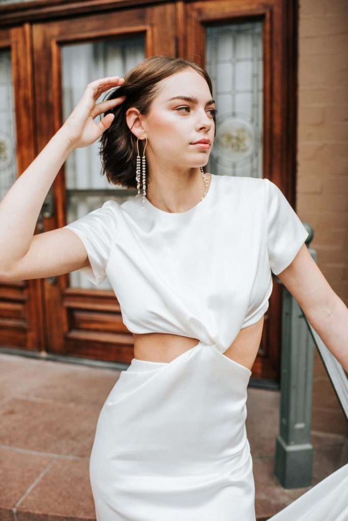 We’re beyond obsessed with the cool girl bride vibes, and this silky The Label gown from a&bé bridal shop Austin is just the perfect wedding dress to copy the look. Its knotted, open-middle detail, short sleeves and understated beauty will have you turning heads effortlessly. This bride makes a statement with her funky earrings and a more nontraditional gem from Form to Feeling – a ruby and diamond platinum ring featuring a 1.89ct oval ruby and 1 total carat of diamonds.