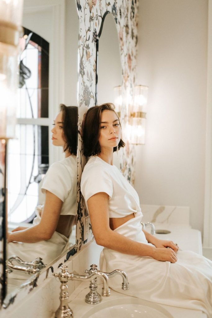 Bring “Bridgerton” regal into a modern-day look with this Alena Leena gown from a&bé bridal shop Austin featuring romantic flutter sleeves and a bustier bodice leading into a full ballgown silhouette. Keep it classic by pairing with Form to Feeling‘s 2-carat diamond stud earrings in platinum martini settings, Triple strand Akoya Pearl Bracelet, as well as a 3-carat diamond classic solitaire engagement ring, set in platinum since it is your wedding, after all! A platinum wedding band for him should make it even, and the pearl statement headband is optional, but we think you’ll want to give it a try.