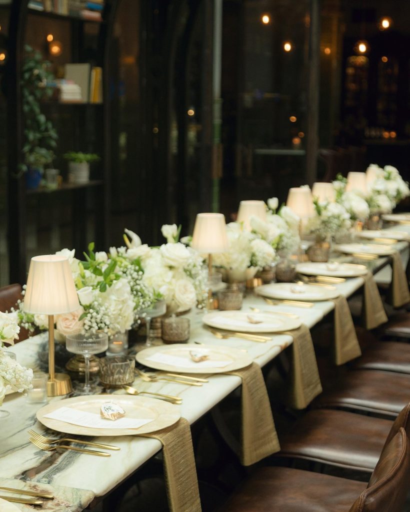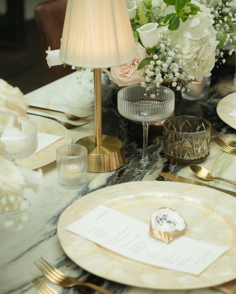 Megan + Anthony’s classy and moody reception is everything! From the table lamps, to the oyster shells, the details were perfection.