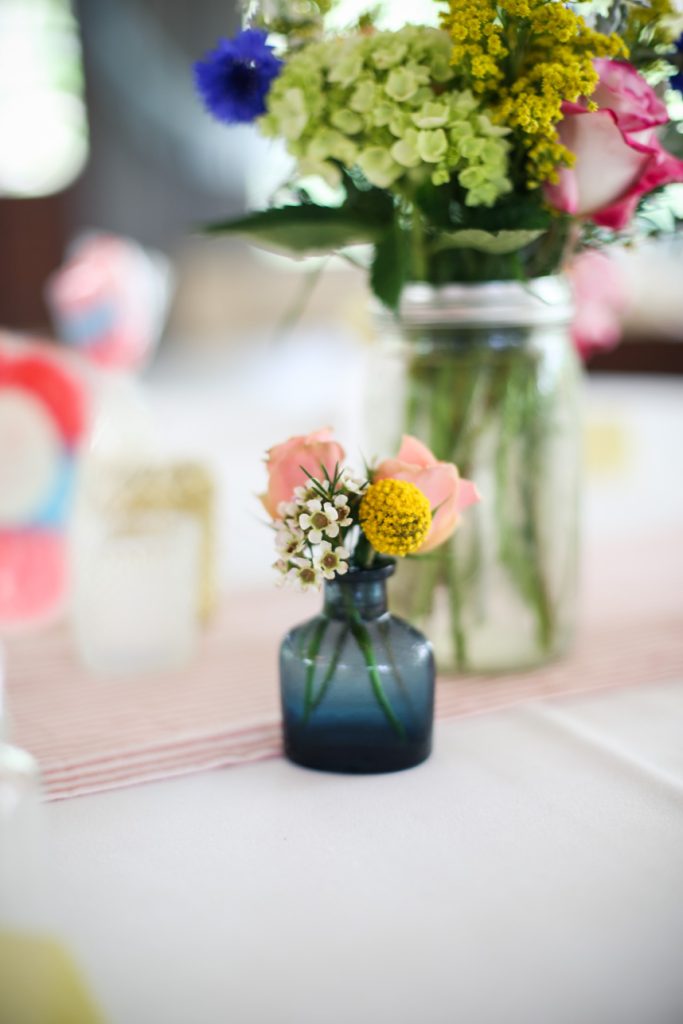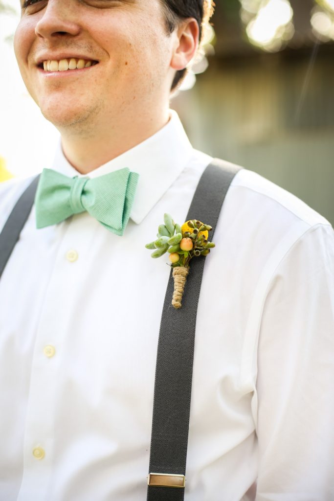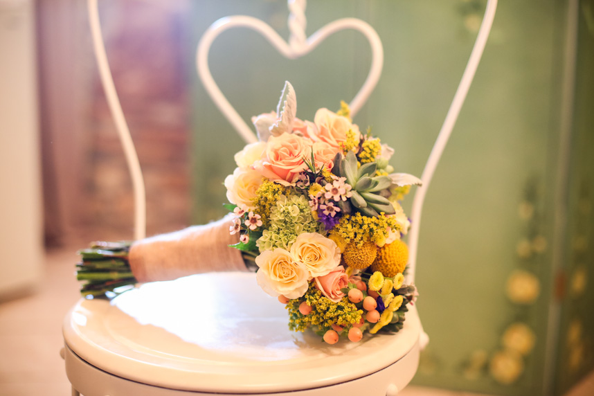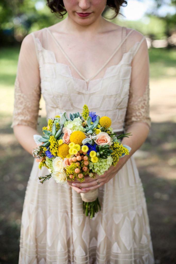 BEAUTIFUL BLOOMS: Caitlin carried a soft, vintage-inspired bundle of succulents, dusty miller, roses and craspedia in shades of dusty teal, yellow and peach.