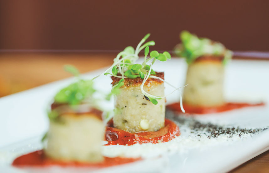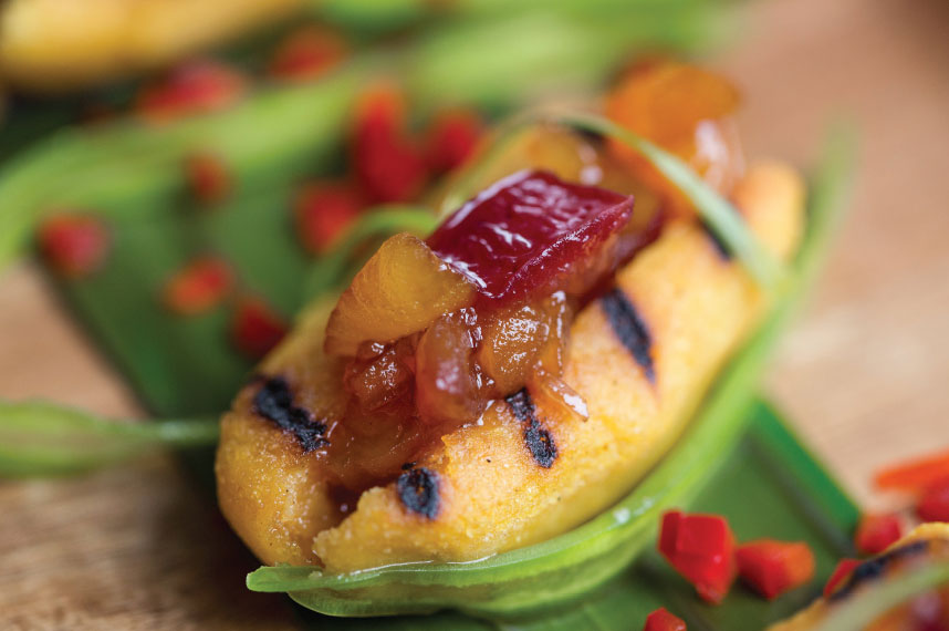 Poblano Polenta Cake – Seared poblano polenta cake, annatto adovada, toasted cracked sesame seed and alfalfa
