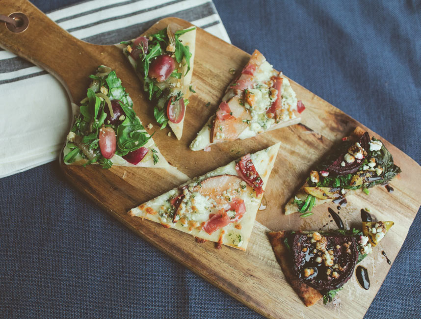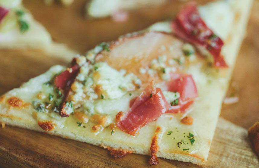 Pear and Prosciutto – Pear, prosciutto and gorgonzola on grilled walnut flatbread + rosemary honey