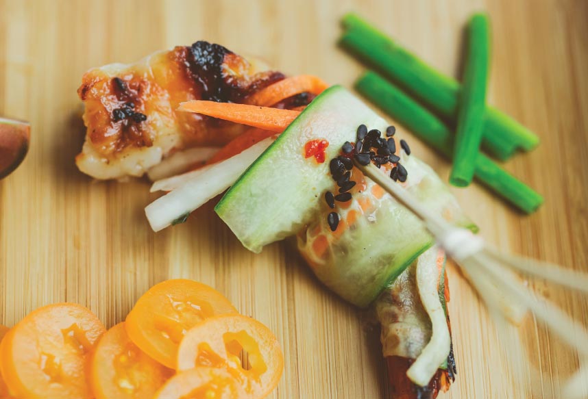 Shrimp Wrap – Bánh MÍ and cucumber charred shrimp wrap with sweet chili glaze