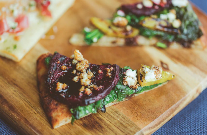 Beets and Chevre – Crimson and golden beets, kale and chévre on grilled flatbread + balsamic reduction