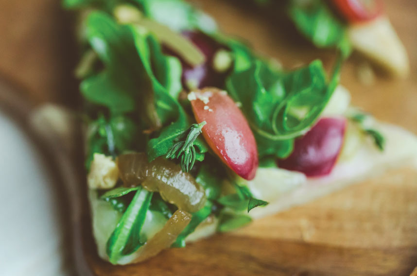 Grape and Cheese – Thyme-roasted grapes, double cream brie, caramelized onion jam and arugula on grilled flatbread