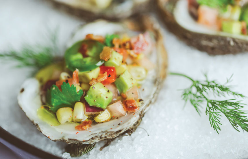 Southwestern Oyster – Corn, red onion, tomato, bacon, lardons, cilantro and avocado