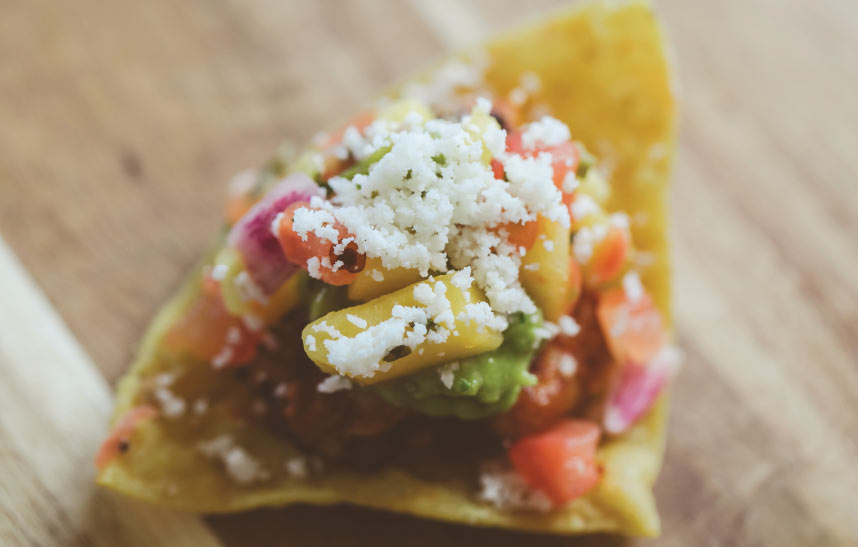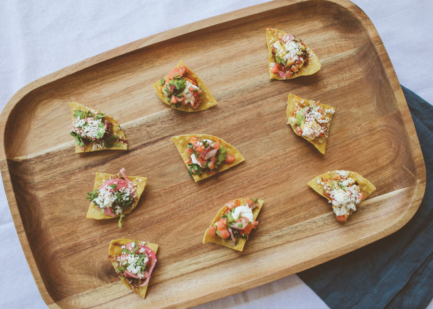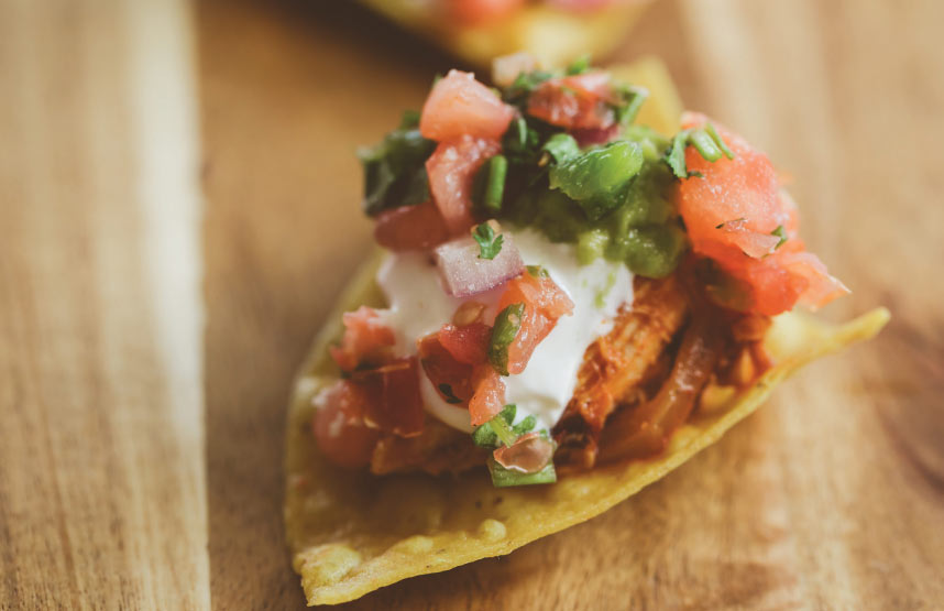 Tingo Nacho Bites – Chicken tingo (chipotle marinated smoked chicken), topped with guacamole, sour cream and pico de gallo