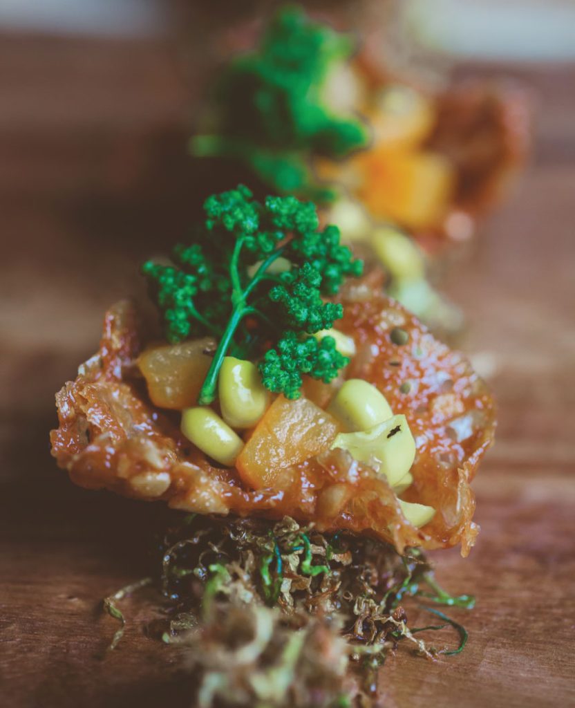 Sweet Tuille – Sweet tuille, grilled butternut and corn succotash, huauzontle and quick fried brussels sprout