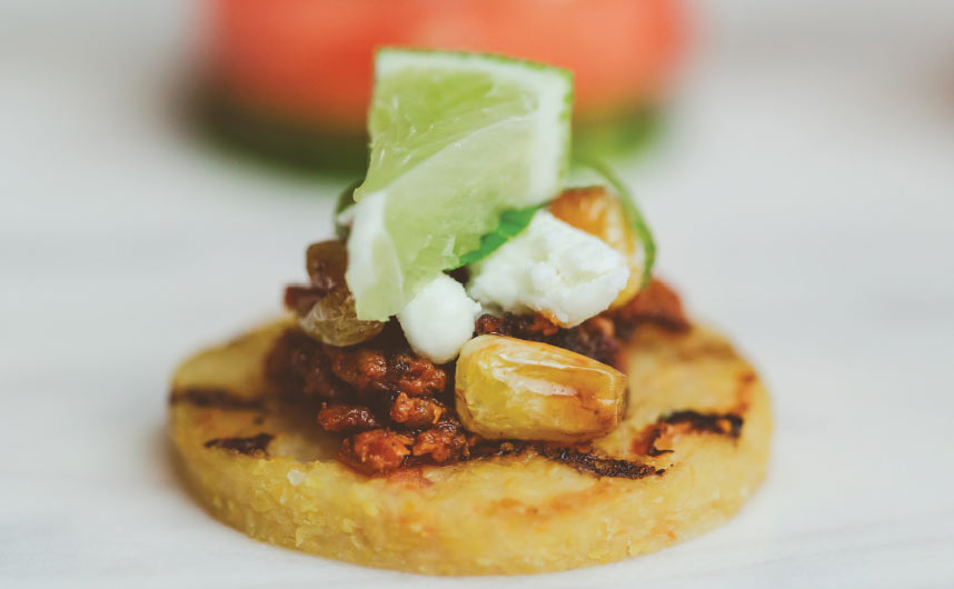 Mexican Corn Polenta Bite – Tempeh based soy chorizo, roasted farm fresh sweet corn with a splash of lime