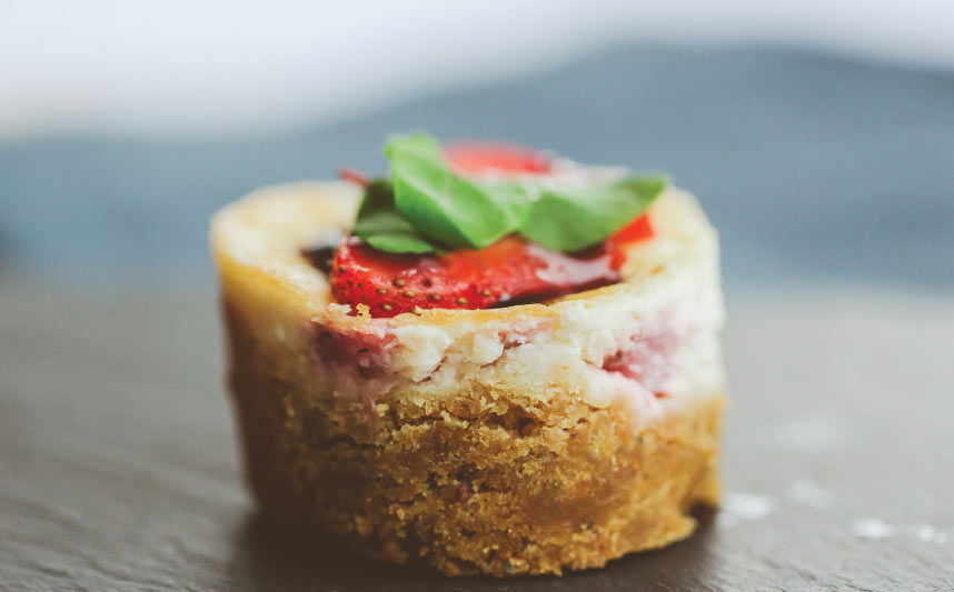 Brie Savory Cheesecake – Creamy brie cheese, herb buttery cracker crust with hints of strawberries and candied Texas pecans