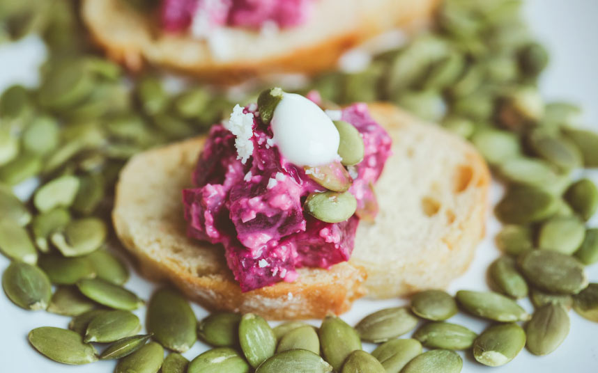 Beet Tartare Canapé – Roasted beet, feta, pepita, citronette on seeded flatbread