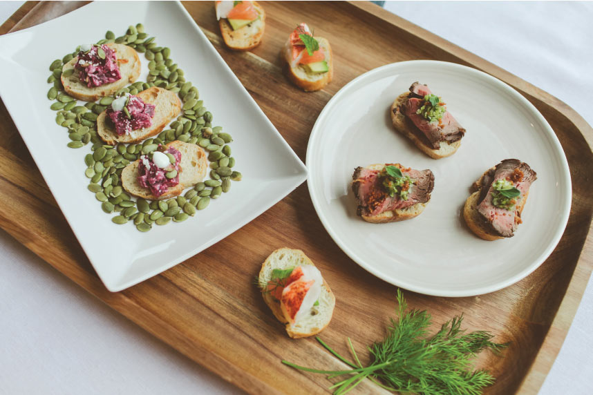 Bison Tenderloin Canapé – Bison tenderloin canapé with toasted garlic and citrus gremolata