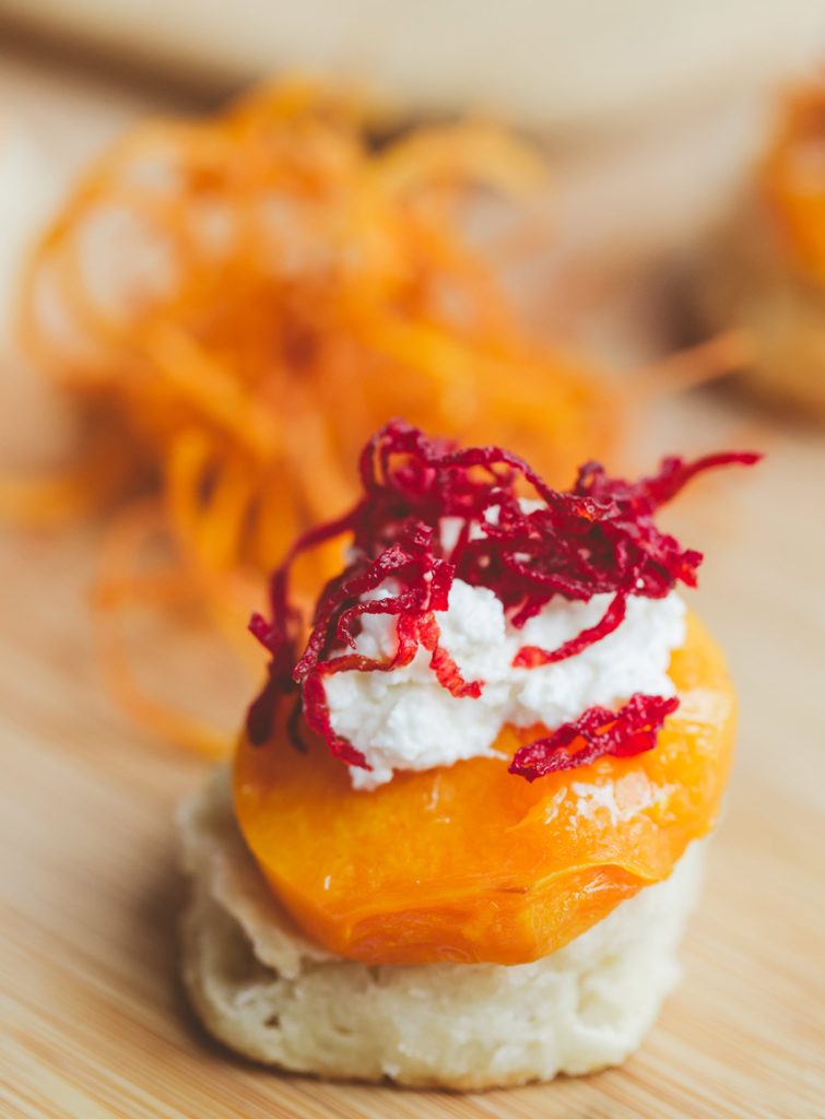 Butternut Squash Biscuit – Roasted butternut squash, chévre goat cheese and fried beets