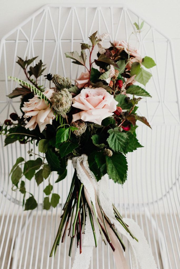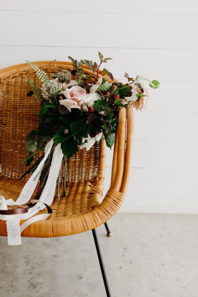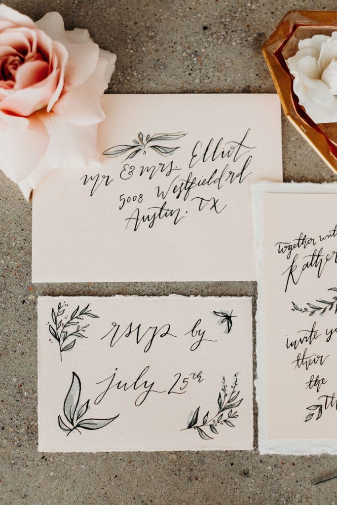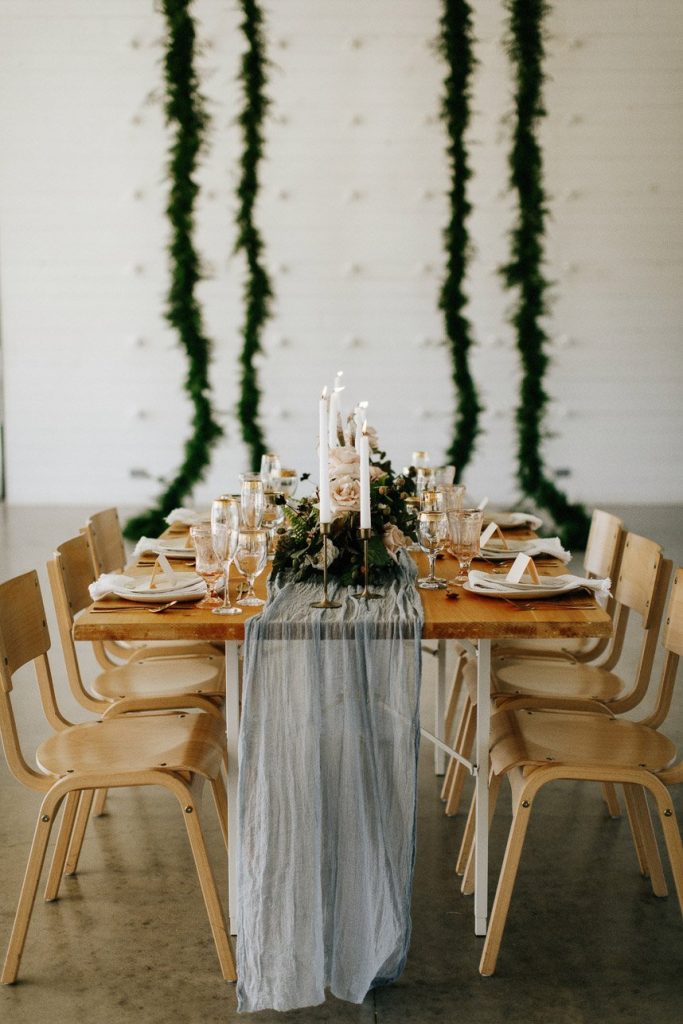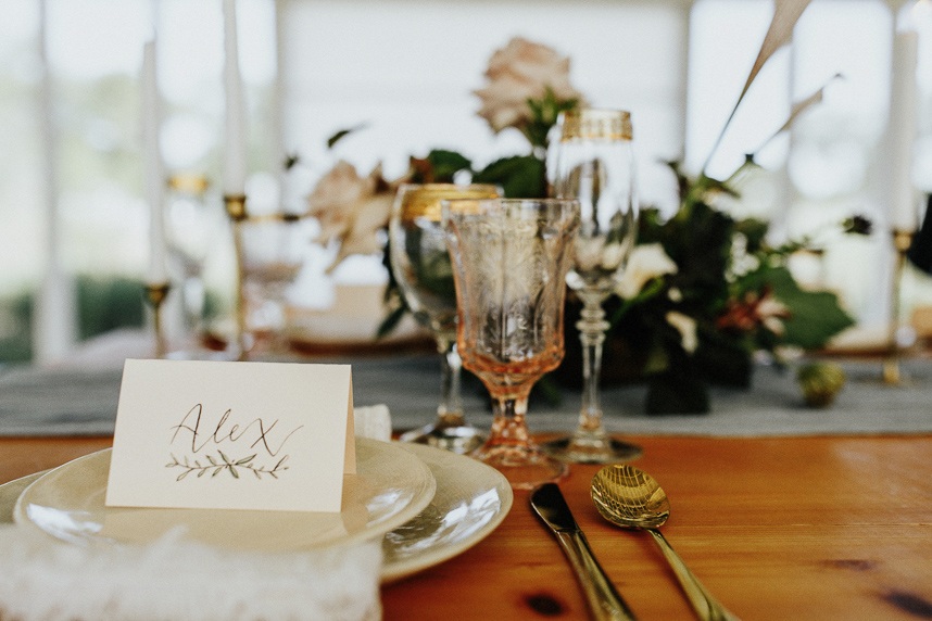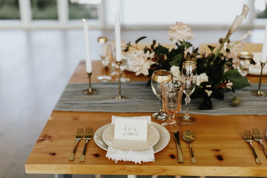 Modern and vintage, sweet and stunning all in one, this contemporary boho wedding inspiration shoot gives us all the feels! From the hand-drawn stationery to the wicker chairs and thin strands of dark greenery suspended from the ceiling, this shoot had no shortage of visually interesting elements. Gold-rimmed glassware, candlesticks and a linen table runner in muted gray-blue give texture to the vintage-style table from Loot Vintage Rentals, and organic blooms paired with fronds and loose greenery by Bricolage Curated Florals added to the boho vibes. Pairing modern elements like glass and stark white frames with more “undone” elements like the florals and semi-naked cake prove that opposites do attract, and they look oh-so-good together! Be sure to scroll down to read planner Kelly Jones’s account of the day and to watch a behind-the-scenes video of this amazing styled shoot!
