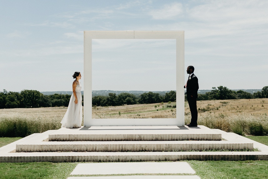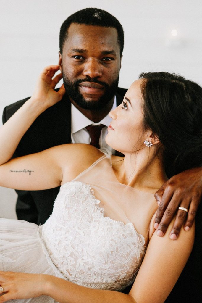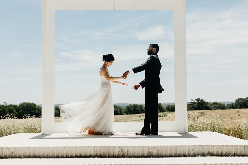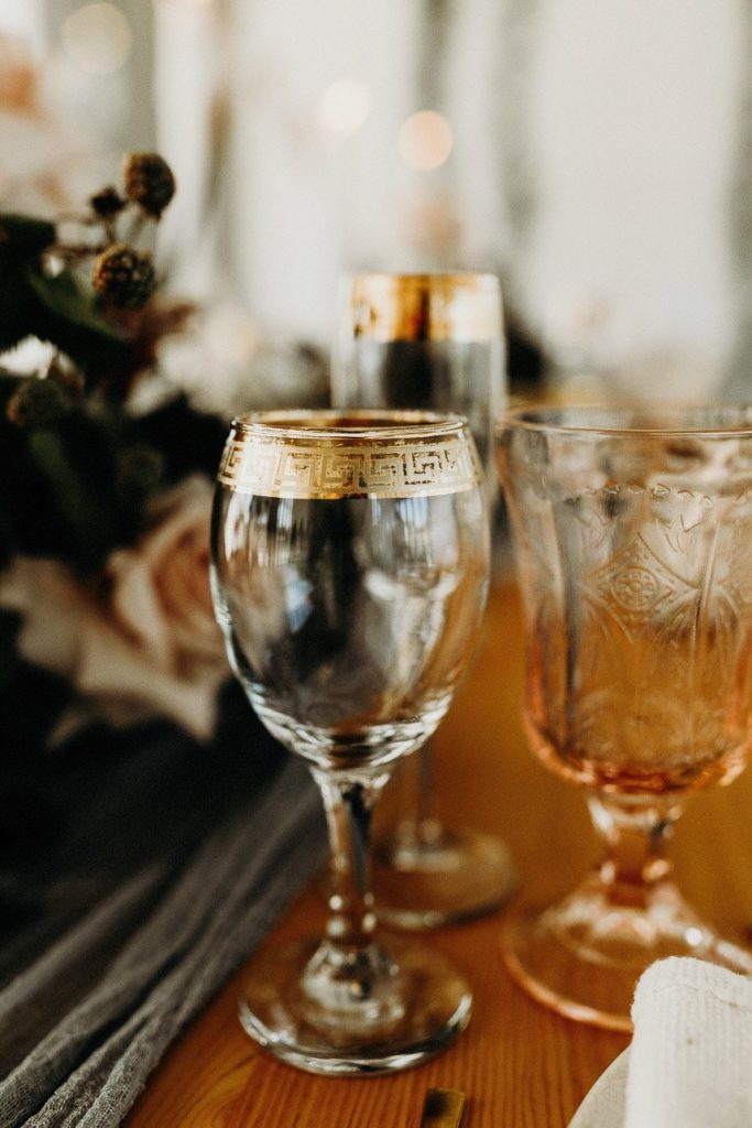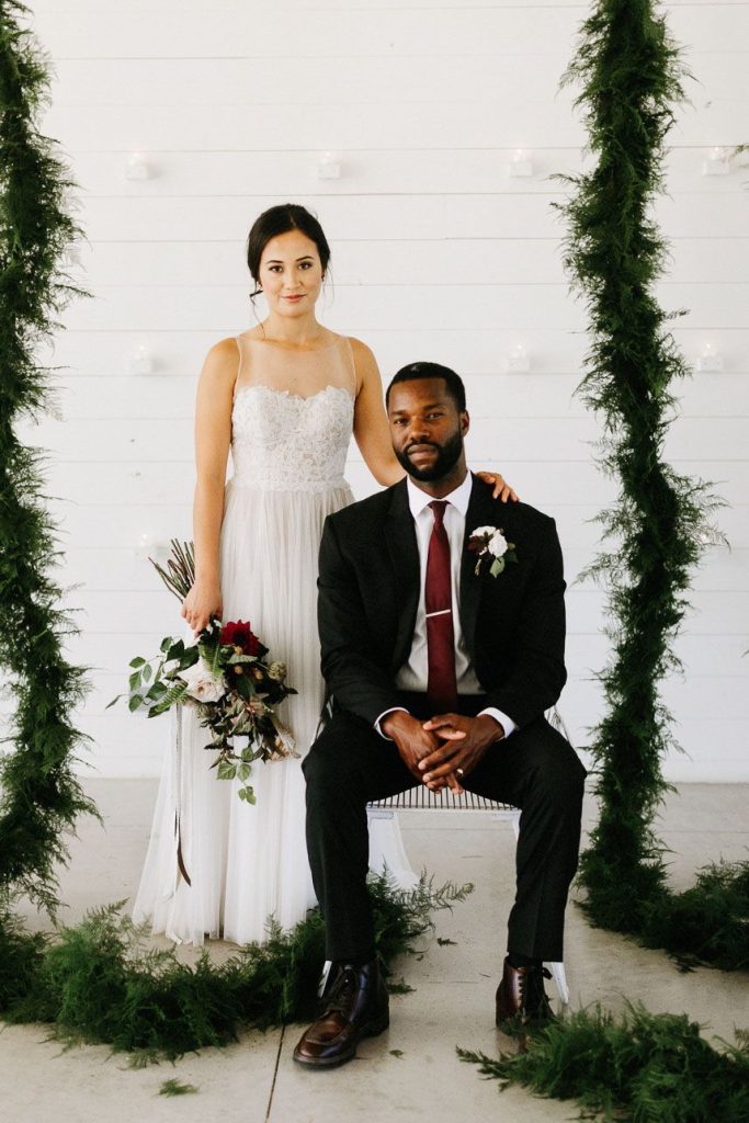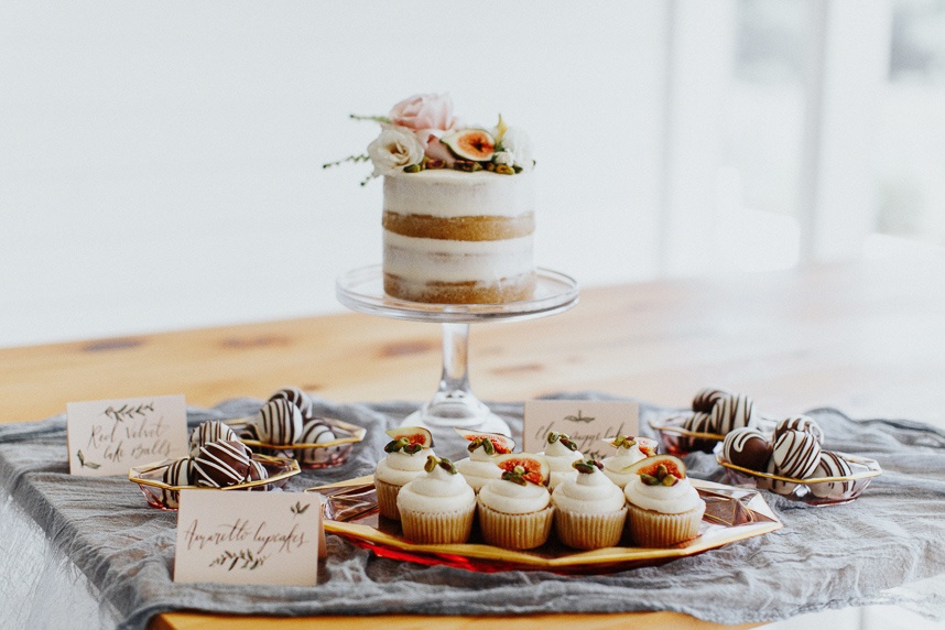 Modern and vintage, sweet and stunning all in one, this contemporary boho wedding inspiration shoot gives us all the feels! From the hand-drawn stationery to the wicker chairs and thin strands of dark greenery suspended from the ceiling, this shoot had no shortage of visually interesting elements. Gold-rimmed glassware, candlesticks and a linen table runner in muted gray-blue give texture to the vintage-style table from Loot Vintage Rentals, and organic blooms paired with fronds and loose greenery by Bricolage Curated Florals added to the boho vibes. Pairing modern elements like glass and stark white frames with more “undone” elements like the florals and semi-naked cake prove that opposites do attract, and they look oh-so-good together! Be sure to scroll down to read planner Kelly Jones’s account of the day and to watch a behind-the-scenes video of this amazing styled shoot!