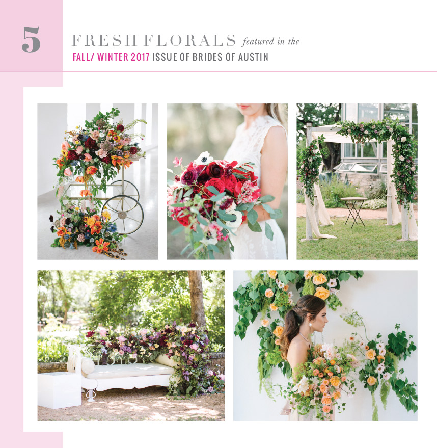 With the release of the Fall/Winter 2017 issue just days away, we’re thrilled to once again begin our countdown to the cover of the new Brides of Austin issue! We’re kicking things off with five fresh florals you’ll find in the all-new issue. As you flip through the beautiful pages of the new mag, you’ll find tons of fabulous images featuring some of Austin’s top wedding florists – this is just the beginning!