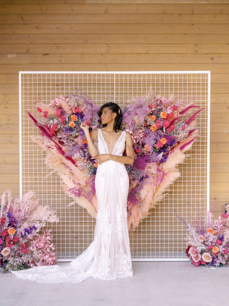 We are just one day away from the Spring/Summer 2020 cover reveal and virtual issue release! WOOHOO! You know what that means… a glimpse at one of our favorite editorials inside the new issue – our Wild Fable fashion editorial, captured by Caitlin Rose Photography at Lucky Arrow Retreat! This oh-so-dreamy color story was brought to life by Remi + Gold via an electric and playful palette of fuchsia, lavender and magenta, and this jaw-dropping heart-shaped grid floral installation is one of many you’ll see in the spread. Our model bride fit the whimsical scene perfectly with her sleek Badgley Mischka lace gown from Blush Bridal Lounge, barrette-clipped hair by flAir Style Lounge and bubbly personality. Completing the look were handmade jewelry earrings from On a Limb Creative and a dazzling engagement ring from Form to Feeling. And Voila! Be sure to check back for the full shoot – you won’t want to miss the incredible behind-the-scenes video PhotoHouse Films recorded of the day! PLUS set a reminder to check back tomorrow for the cover reveal! Cheers!