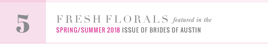 With the release of the Spring/Summer 2018 issue just days away, we’re thrilled to once again begin our countdown to the cover of the new issue of Brides of Austin! We’re kicking things off with five fresh florals you’ll find in the all-new glossy. As you flip through the beautiful pages of the new mag, you’ll find tons of fabulous images featuring some of Austin’s top wedding florists – this is just the beginning! Be sure to stay tuned to the blog as we continue to countdown to the cover over the next few days! Cheers!