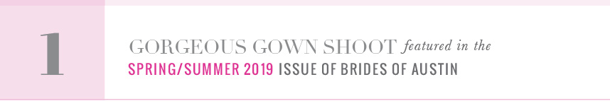 For the final installment of our countdown to the Brides of Austin cover, we’re elated to share a sneak peek from our Spring/Summer 2019 fashion editorial! Captured by Kristin La Voie Photography at Camp Lucy, this incredible Modwest inspiration features jaw-dropping gowns like the uniquely chic off-the-shoulder Moonlight and Moss gown, plus more amazing fashion-forward dresses (and even a pant suit!) from Unbridaled, Julian Gold, Blush Bridal Lounge and Beatitude Bridal Boutique. The shoot showcases, not only pretty gowns, but gorgeous blooms from Wildly Cultivated Floral Design, Insta-worthy beauty looks by Beautymark Agency and exquisite fine jewelry from Eliza Page. You’ll be smitten as you flip through page after page of stunning bridal looks! Stay tuned for tomorrow’s big reveal!