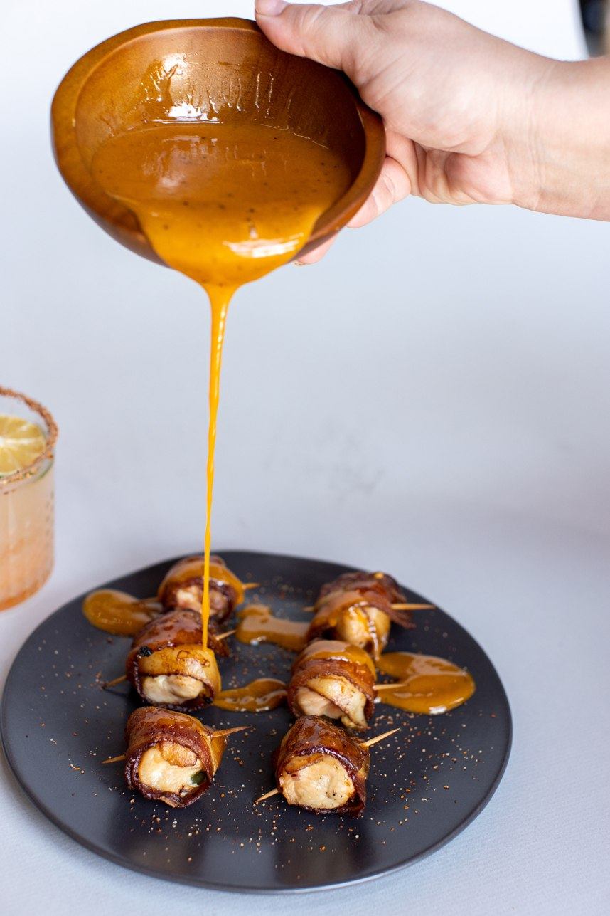 Salt Lick Events & Catering | Quail with jalapeño and sweet onion slices wrapped in bacon and smoked with house spicy BBQ sauce paired with a Paloma cocktail.