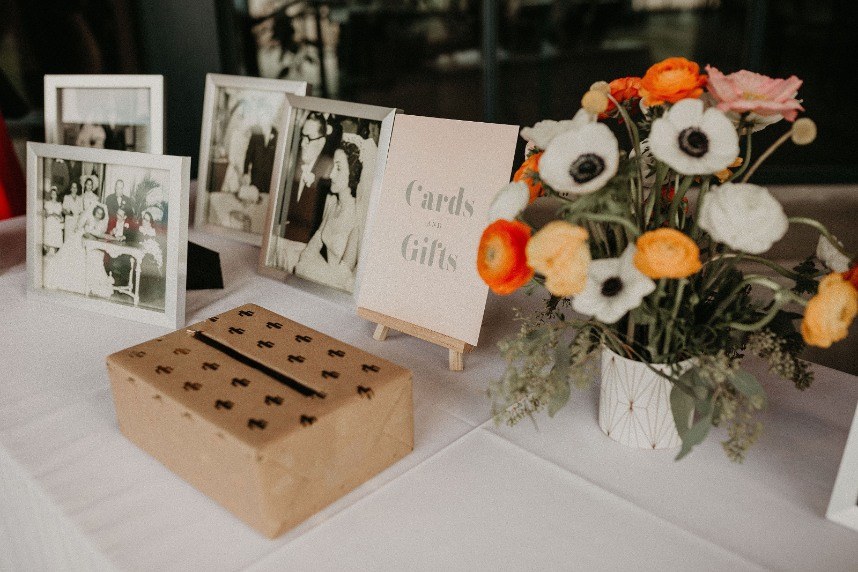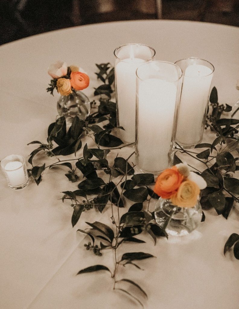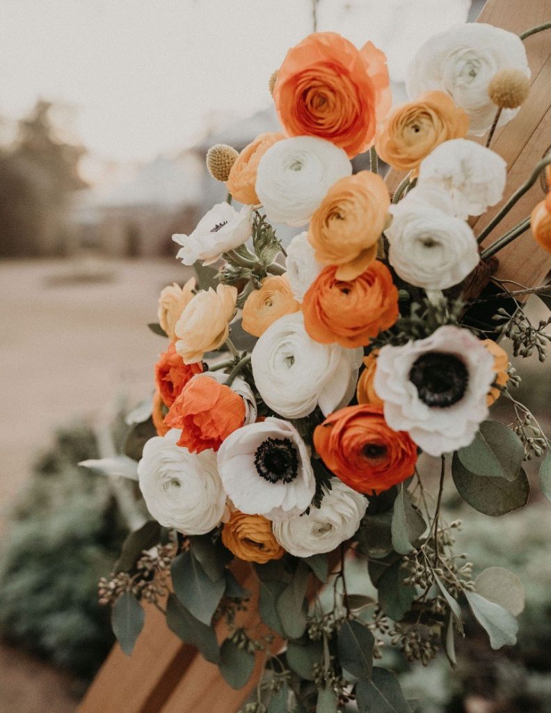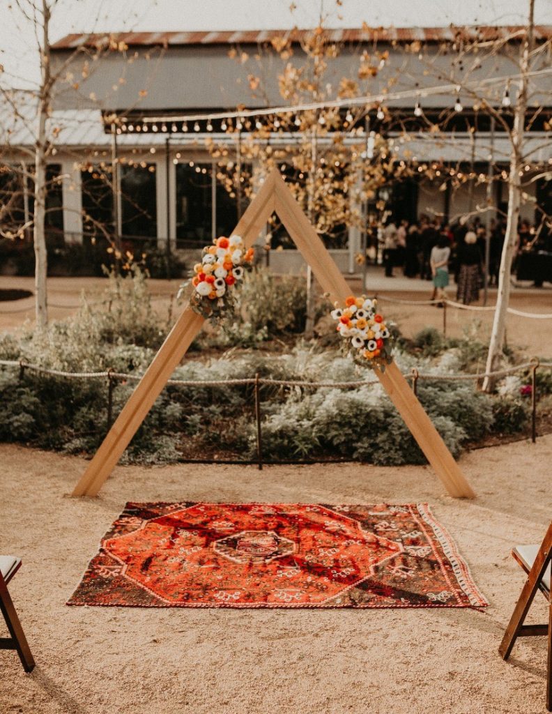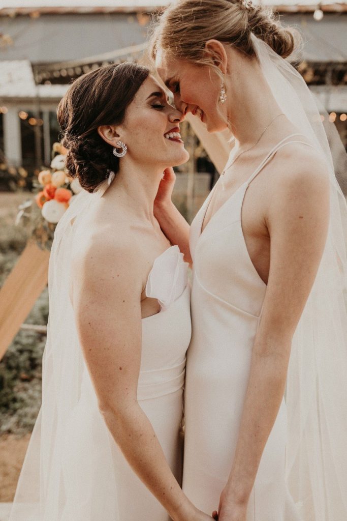 We are loving the details in this desert chic wedding captured by Nikk Nguyen Photo. The brides used accents of orange, yellow and wood to make this day truly a dream. They enjoyed an outdoor ceremony incorporating their parents, poems and joking about how they met. In college, Claudia asked a friend to arrange a group happy hour at a local bar. However, Becca didn’t realize it was a date until arriving three hours late. Even on their wedding day, Claudia still jokes that Becca stood her up on their first date.