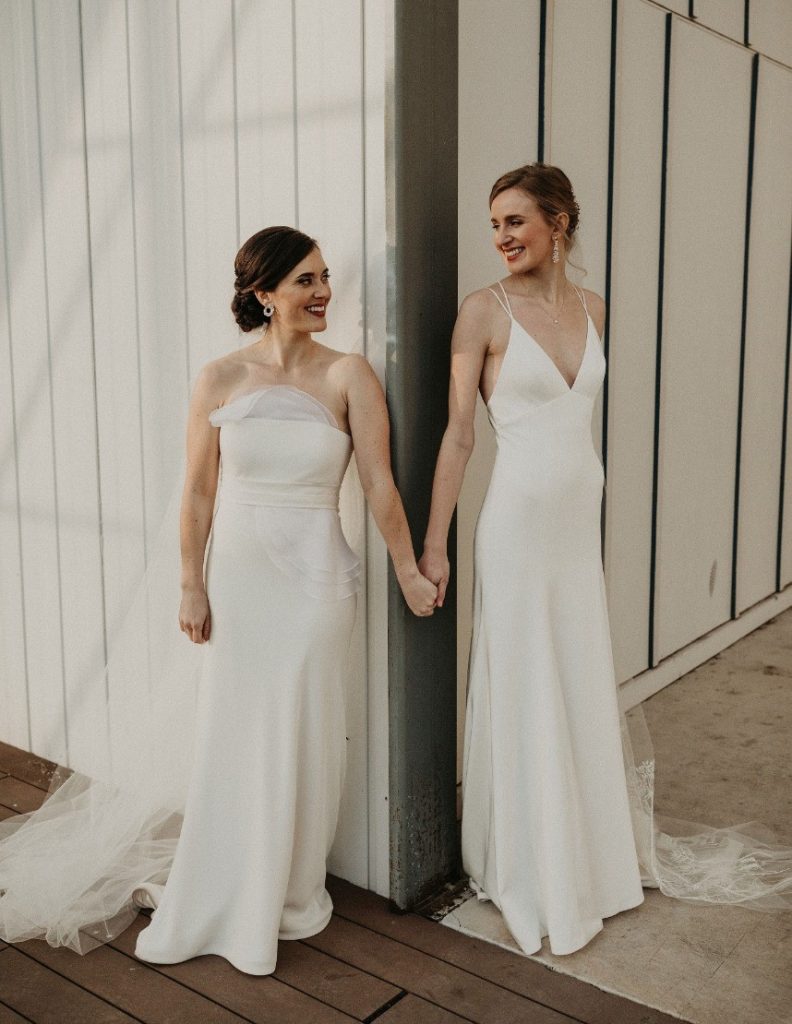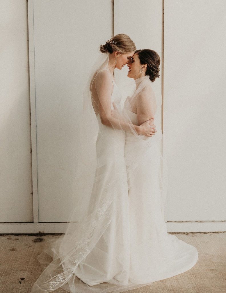 From Rebecca on her favorite detail: “Claudia is Cuban, and one of her family wedding traditions is for the matriarchs of the family to bless the union by wrapping a Mantilla, or lace veil, over the shoulders of the couple. The Mantilla used at our wedding was an heirloom, and it was especially meaningful for her grandmothers to bless our union as a same sex couple.”
