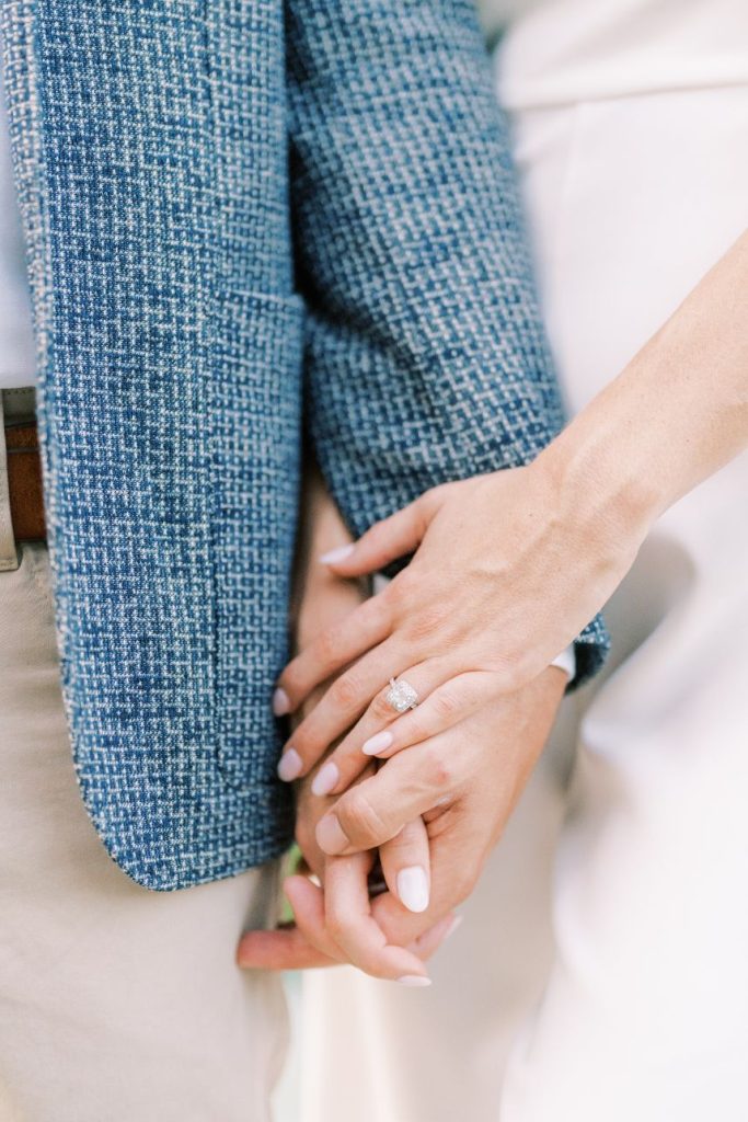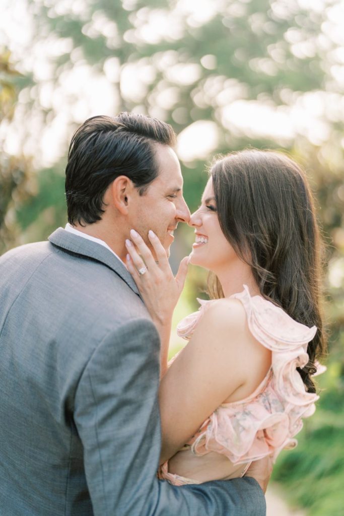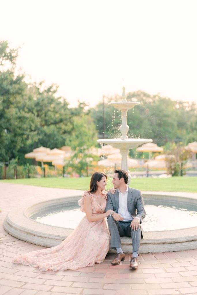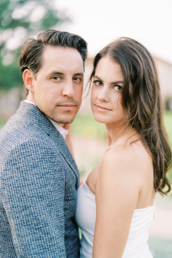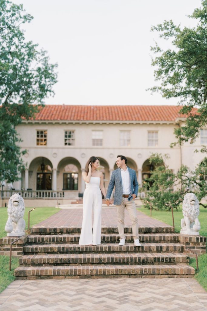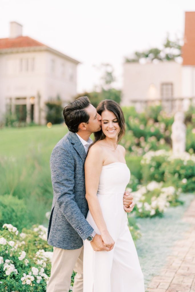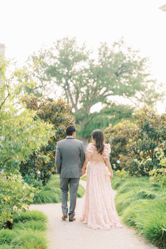 Emma and Austin make the most perfect pair, captured by Sarah Tribett Photography around a grand outdoor setting where their style and chemistry could take center stage in this dreamy garden engagement session. Their sweet love began when Emma was bartending in Dallas while finishing college and Austin walked in with a friend. The two hit it off instantly, and by the end of the night, his number was on a napkin being slid across the bar to Emma requesting a date. She waited a few weeks before giving him a shot, being hesitant to go on a date with someone she met in a bar, but when she finally did the rest was history! When the two were preparing to move in together, Emma took a break from cleaning out her apartment to lay down for a nap and looked up to see Austin kneeling next to her with a ring! In a secluded, intimate moment with just the two of them in the apartment, she said yes!