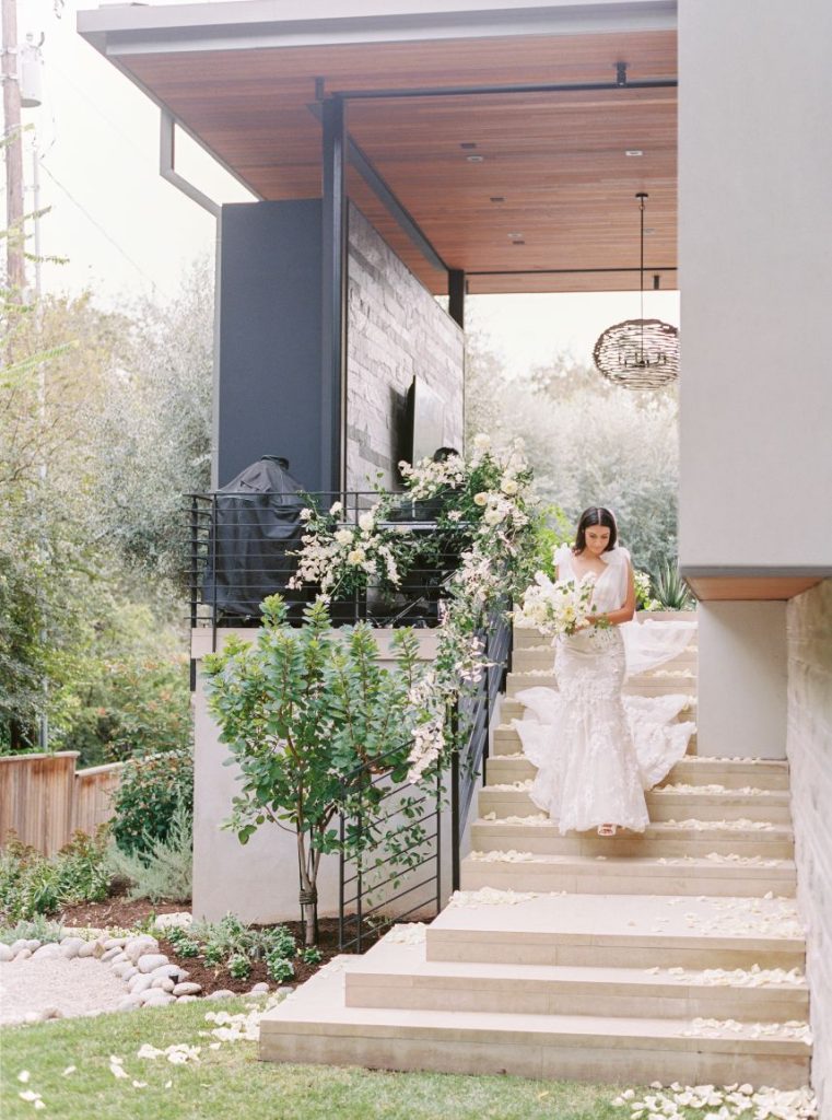 “So we canceled and toyed with moving it to 2022. But by this point… The thought of planning another event was too much. We also desperately wanted to be married! So we made a sharp right turn, and decided to get married at Andrew’s parent’s backyard.” Andrew’s parents live in the beautiful, modern west Austin home seen below that they designed and built in 2017. Featured in the AIA Austin Home Tours and one of Christina and Andrew’s favorite places to be, it made perfect sense for their intimate backyard wedding! There were only 11 guests at the wedding itself where the two exchanged heartfelt vows, heard a poem reading, and were married by their closest friends. They followed the personal ceremony with a socially distant reception in the front yard with the wedding party, around 28 guests. Think a la carte cocktail hour and COVID-safe dining, like takeaway fried chicken biscuits and biscuit cinnamon rolls for each couple in attendance! Throughout the entire elegant affair, The McKellars captured sweet candid scenes that played out in this intimate backyard wedding for the newlyweds to enjoy time and time again. Keep scrolling to see the video highlight and read on for a note from the bride about her favorite wedding vendors and what made them so special. Cheers to Christina and Andrew!