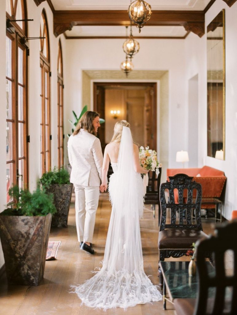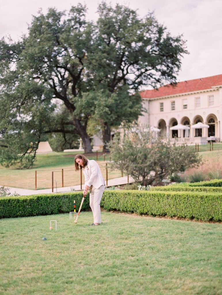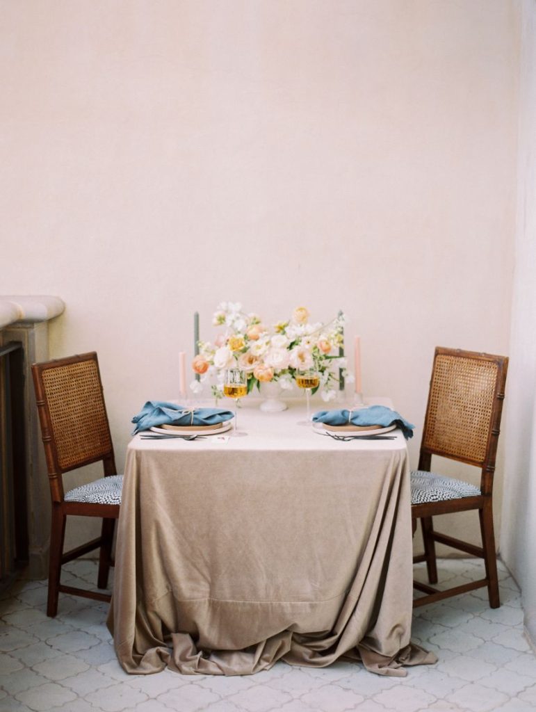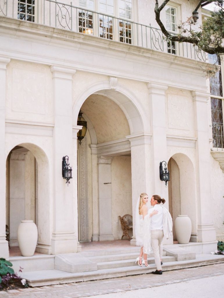 From the planner, Lauren Field Design: “An elopement weekend set amongst the Texan meets European heritage of The Commodore Perry Estate, inspired by the sophisticated architecture of the estate and the nostalgia of leisurely travel. It was important for us to capture the experience of the signature spaces and landscape of the property and transport the couple to a one-of-a-kind oasis with a European vibe. Tones of blue, shades of peach/terra cotta, taupe, and golden ivory are surrounded by grand old-world architecture and finely crafted details.”