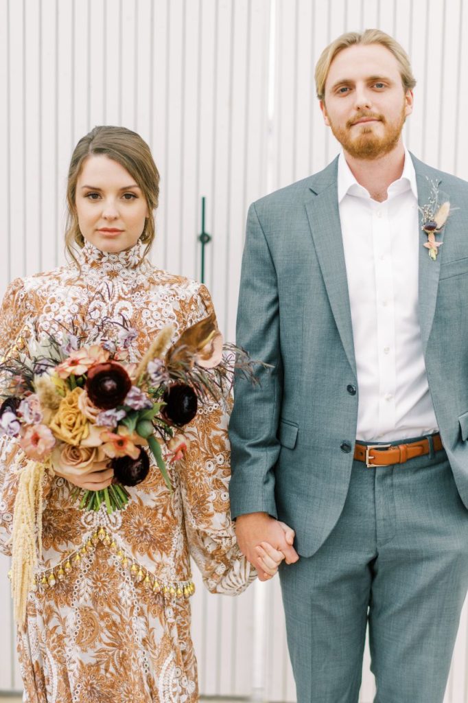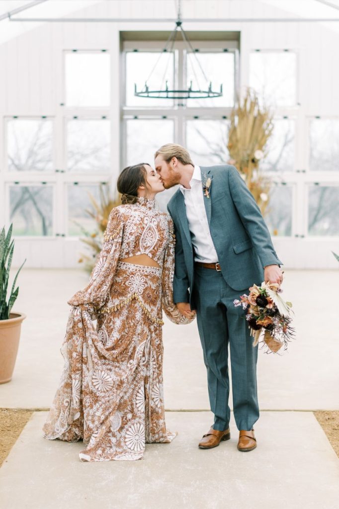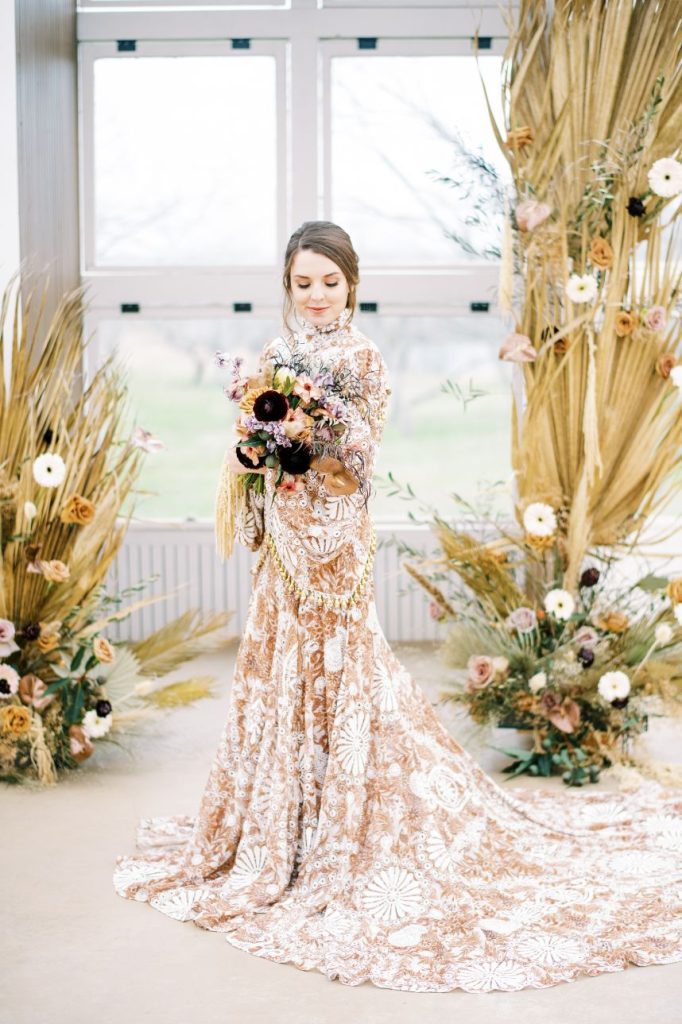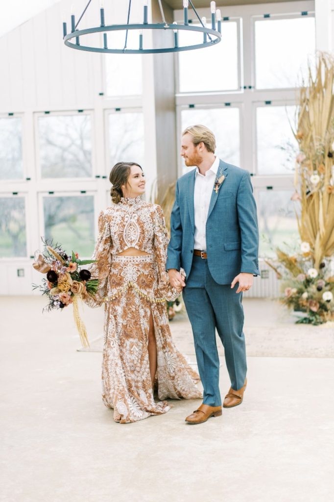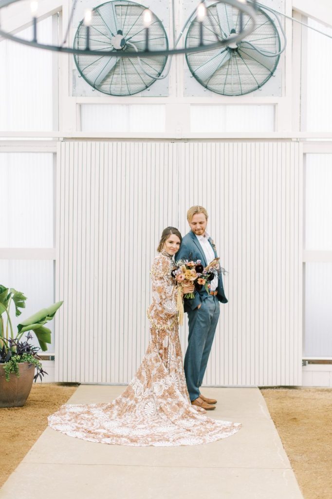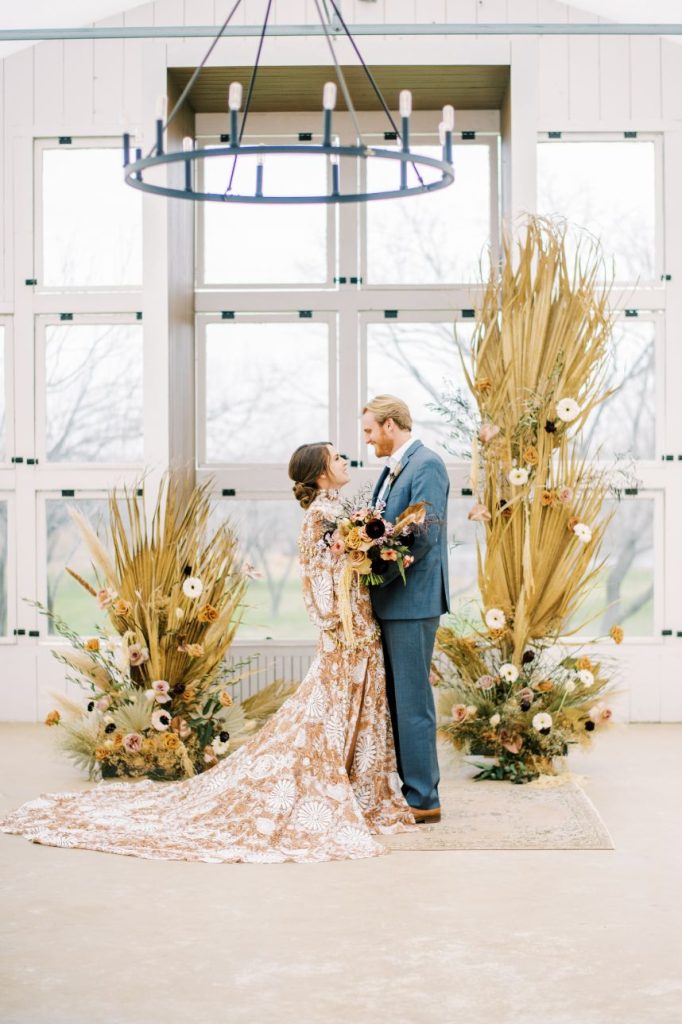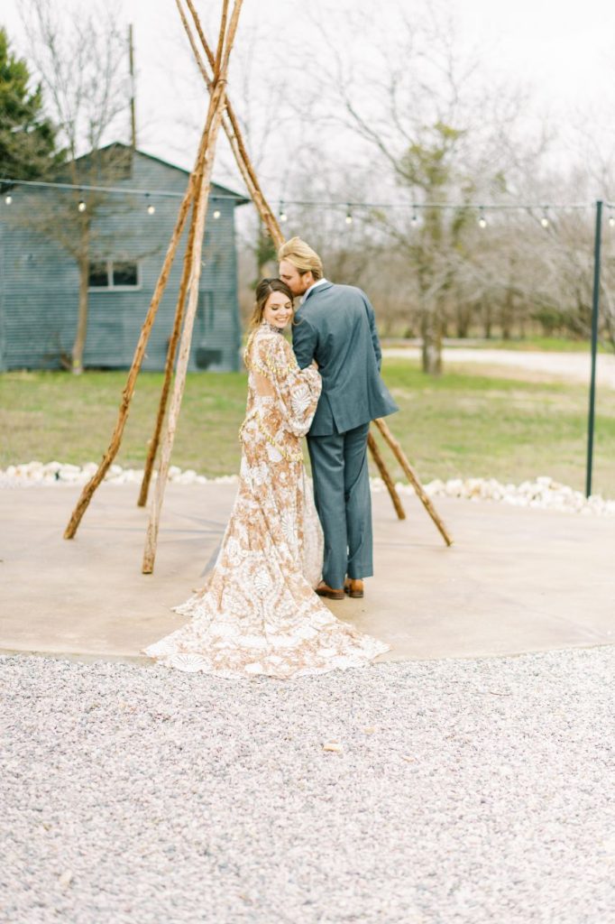 From the planner: “I was lucky enough to coordinate this shoot with some incredible vendors. It was at the brand new venue, Camino Real Ranch in Lockhart. It was the brainchild of myself and Katie Knotts Photography for a while now and getting to see it come about was life-giving! We were so excited about the color story and the unique florals used by MOON FLORA STUDIO… The Unbridaled dress was MADE for our model Caitlyn and was the most unique piece. We could not have asked for better vendors!”