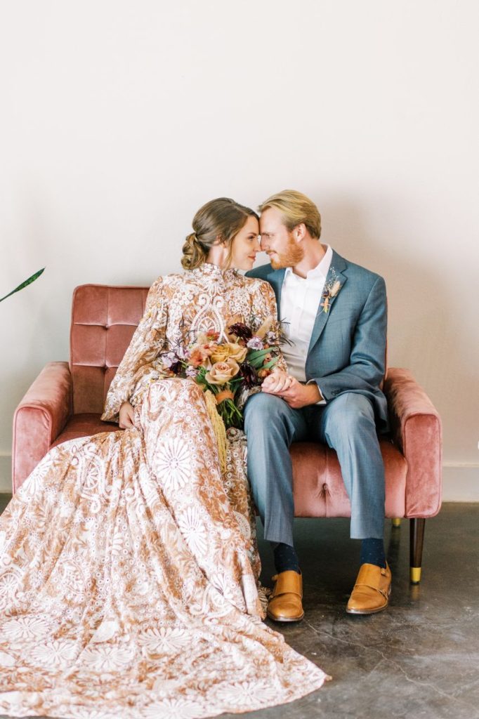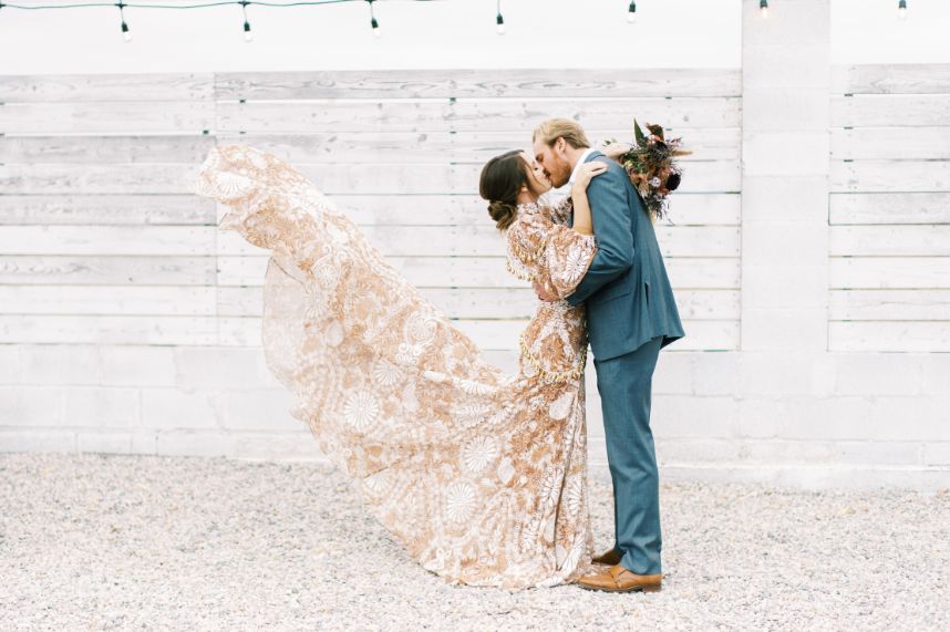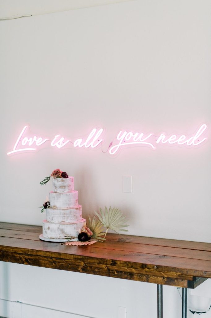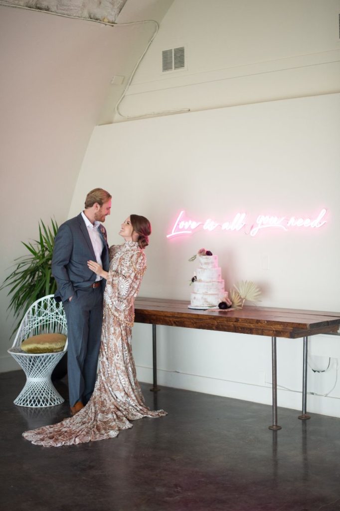 Austin brides are sure to love this eclectic boho wedding inspiration planned and coordinated by Diletta Elaine Weddings to incorporate everything that makes couples want to wed in the desert-esque Texas area. Palm leaves, dried pampas, and garden roses from MOON FLORA STUDIO create the perfect bohemian blend of blooms that make for the asymmetrical altar of our dreams as well as a beautifully moody bridal bouquet. Tablescapes were breathtakingly set and every wedding scene comprised of so many organic details, but all eyes were on the bride. This bride models Rue de Seine’s Archer gown from Unbridaled with a bold, romantic and bohemian spirit that evokes the ornate prints and embroideries of India – with a drape of pearl beading, subtle cutaway bodice, and tassle back detailing. A full circle skirt has deep front splits for movement making this dress is an expression of unbridled joy for a bride dancing with her lover beneath a starry sky. A naked cake and neon signage make us believe love really is all you need after falling head over heels for this eclectic boho wedding inspiration, captured by the talented Katie Knotts Photography in the gallery below. Read on for a note from the planner about some of the vendors that made this magical day come to life. Cheers!