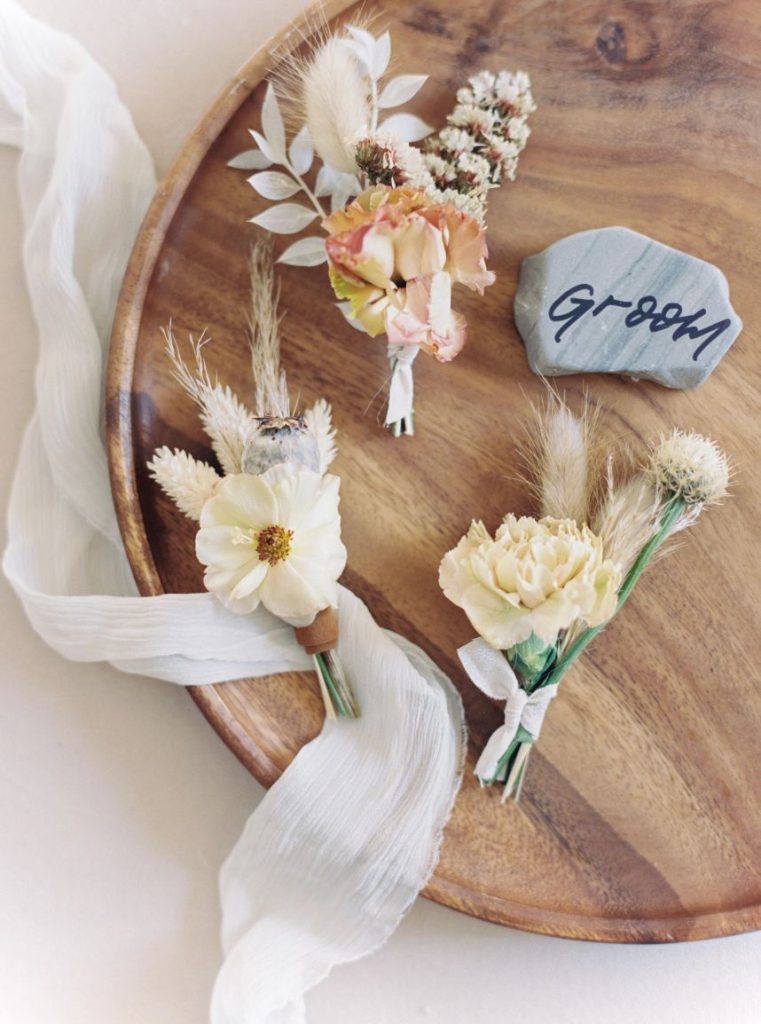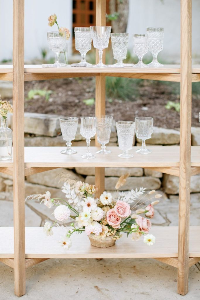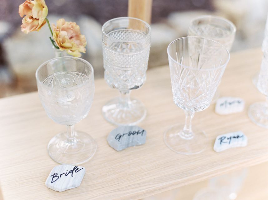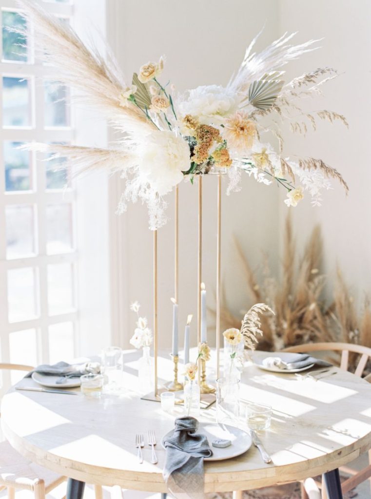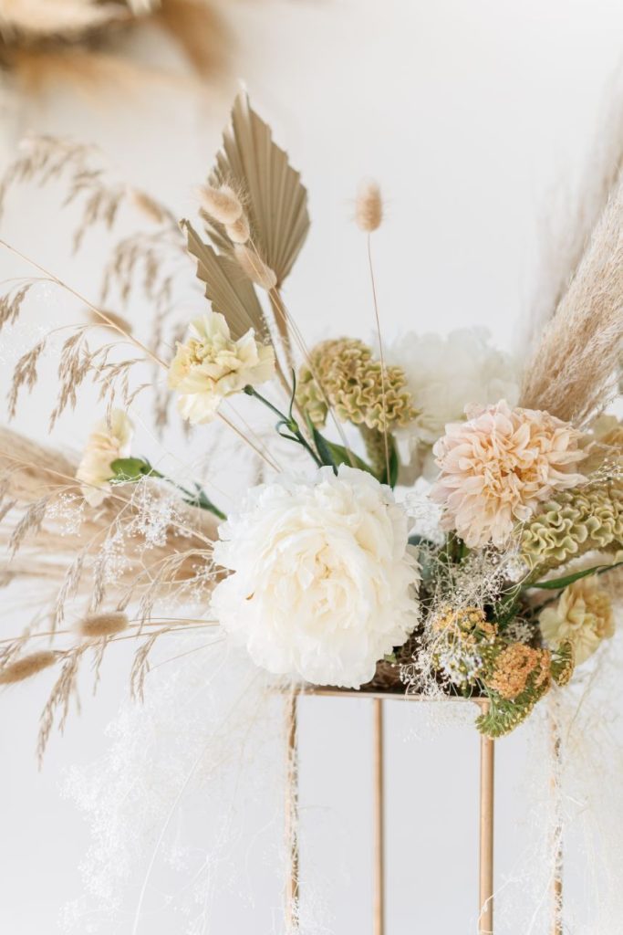 From the planner, Andria Volpicelli of Andria Leigh Events: “The design was centered around neutral tones and creating the perfect, unruffled aesthetic for a late summer or early fall wedding. We mixed silver and copper accents, modern and pressed glassware and peonies with pampas to create visual contrast throughout the entire design. It’s the perfect design for a laid back couple who loves neutrals and isn’t afraid to go outside the box with texture.”