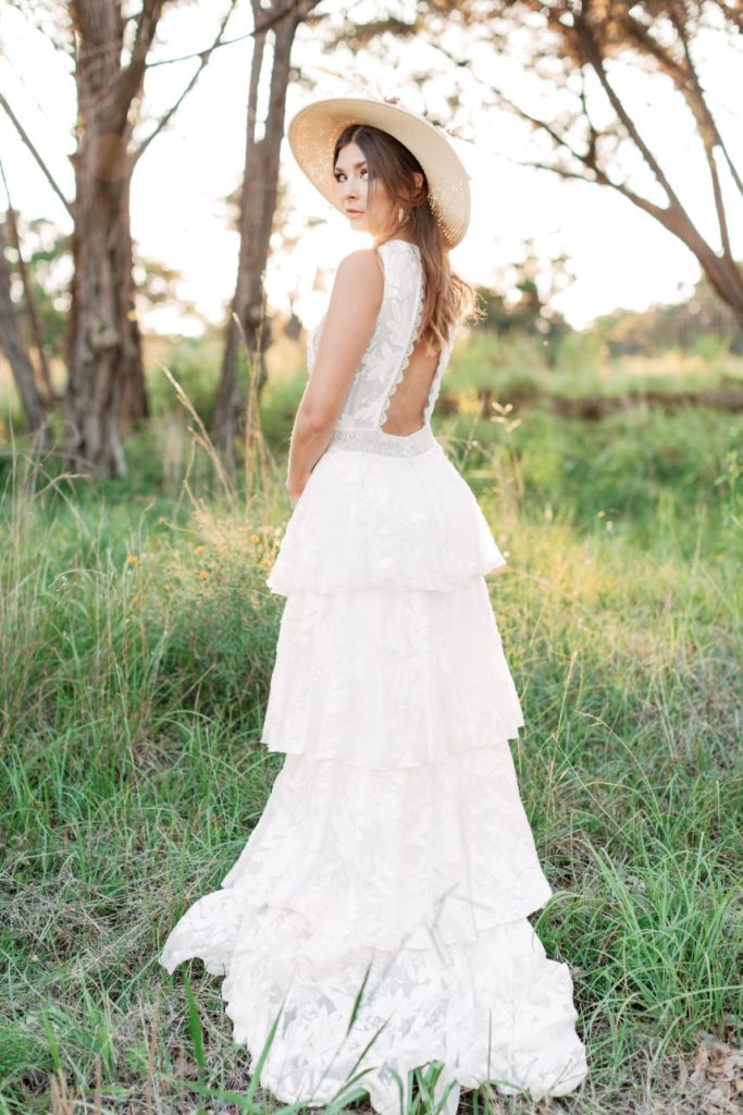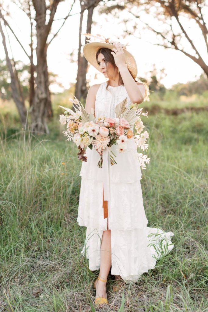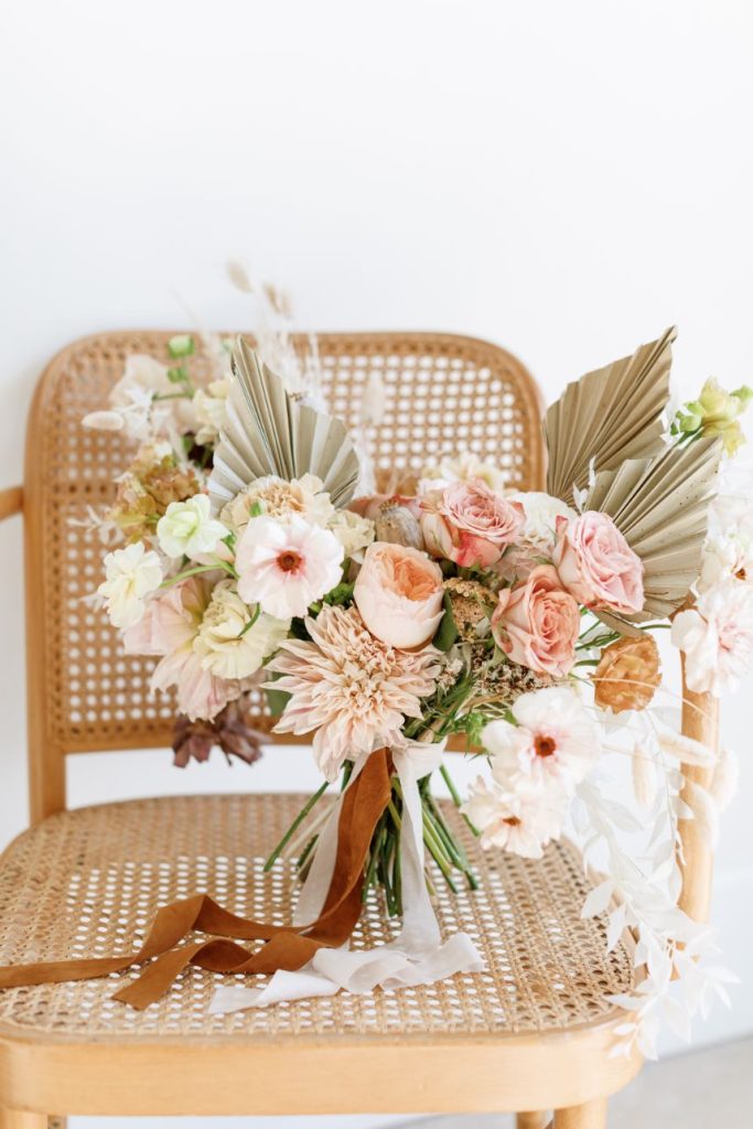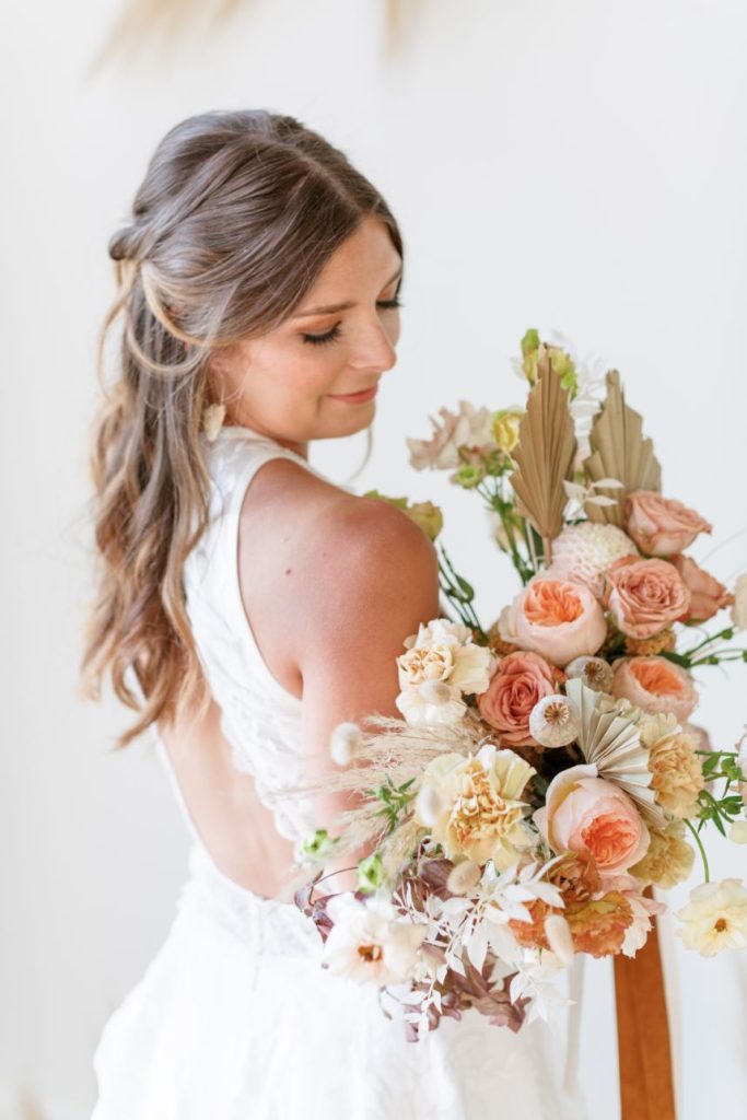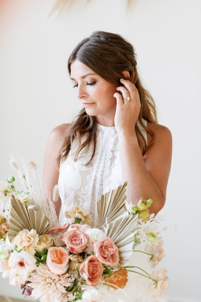When Andria Leigh Events partnered with The Bloom Bar to design this Effortless Earth Tones wedding editorial for Brides of Austin, we knew the result would be something special. Stylist Andria Volpicelli’s vision for the shoot was to create a neutral-toned wedding scape with contrasting elements of modern and vintage, as well as unkempt and clean. The floral design from The Bloom Bar is the first mirror of her vision, combining classic flowers with dried palms. The combination was perfectly executed, setting an unfussy, yet fashionably intentional tone within every scene. A minimalistic table set by Loot Rentals was organic and fresh with loads of texture throughout – linen napkins, natural-fiber rugs, vintage silverware and mod furniture. Design to Flourish’s simple invitation design was a standout among the earthy affair with bold lettering. The cake by 2Tarts Bakery was almost too pretty to eat with it’s unrefined edges and desert-esque color palette. The tiered gown from Unbridaled was fun and unique, featuring lace details and an irresistible slit in the front. The bride’s natural beauty look from Makeup ATX was flawless, loose curls and all. The Ivory Oak provided a bright, sun-soaked scene for Feather & Twine to work their magic and the end result is just stunning. Look below to see all the goodness!