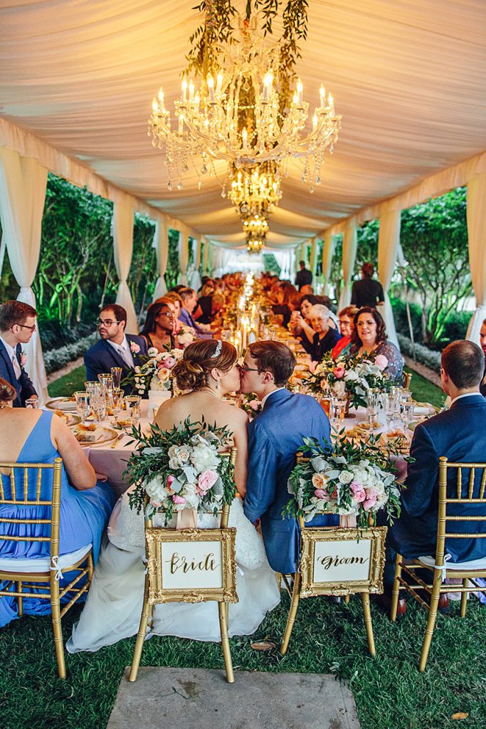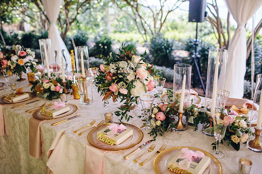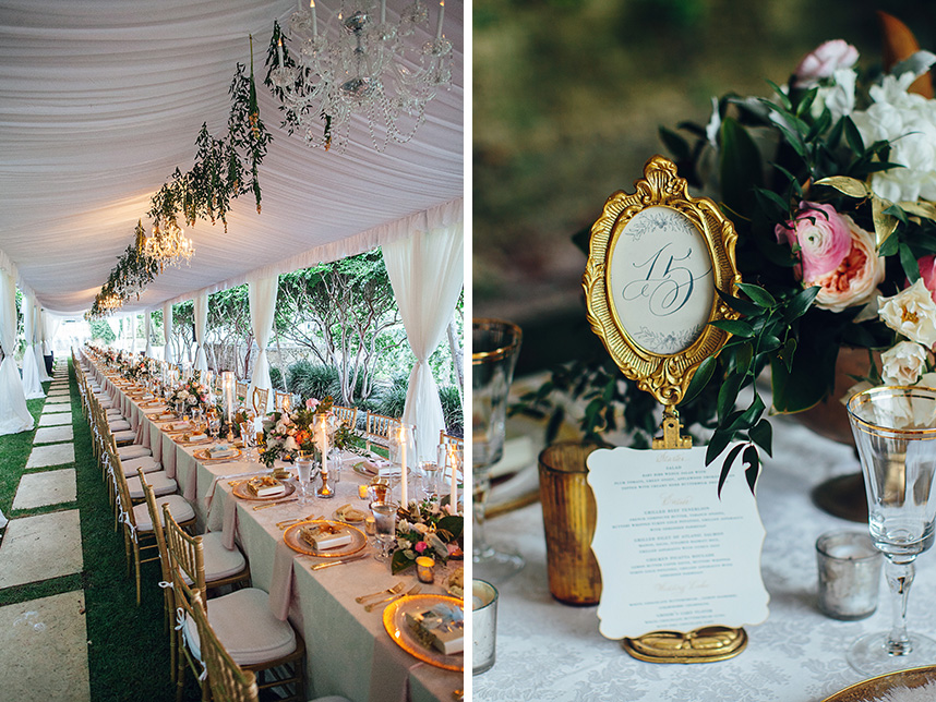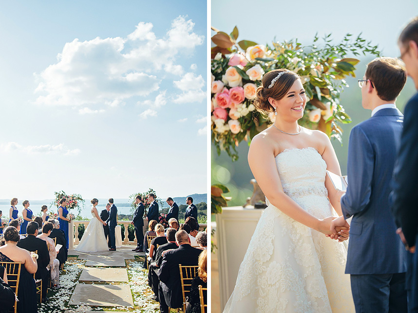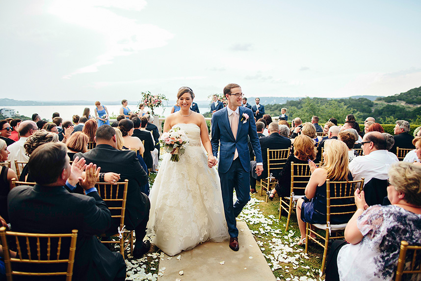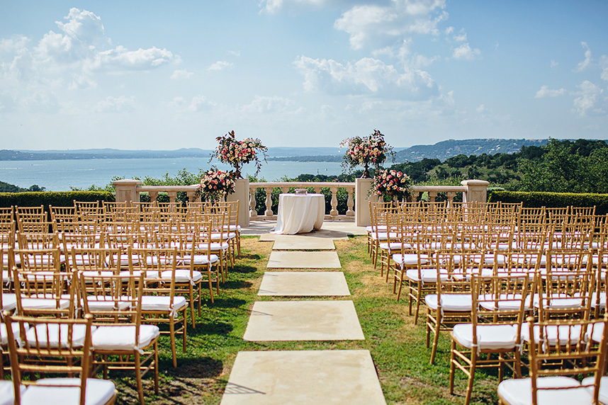 In one of the loveliest of Austin al fresco wedding affairs, Meredith and Michael celebrated their matrimony with an elegant evening on Lake Travis with the help of Pearl Events Austin. Christina Carroll Photography perfectly captured the most intimate moments of the night, from the couple’s stunning cermeony overlooking the lake to the magical ending underneath a sky lit with fireworks. Knowing that she wanted to incorporate a color scheme of French blue, blush pinks and gold, Stems Floral Design created the most beautiful table arrangements and bouquets of english tea roses, peonies and ranunculus in complementary shades of cream, peach and pink. Guests were treated to a dinner set at tables with delicate gold chiavari chairs and an ornate table settings of gold-tinged china and candelabras from Loot Vintage Rentals and Marquee Event Group. To take the night to an even sweeter note, the couple shared a gorgeous four-tier floral embellished cake from Sweet Treets Bakery with their guests – a delicious way of ushering the new couple into newlywed bliss! Be sure to check out more from Meredith and Michaels wedding in the latest issue on newsstands now. Enjoy!