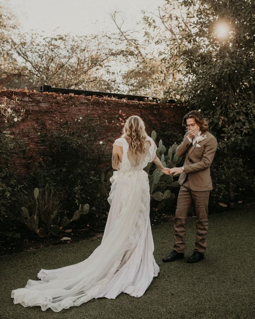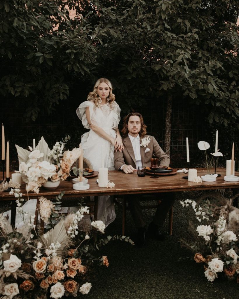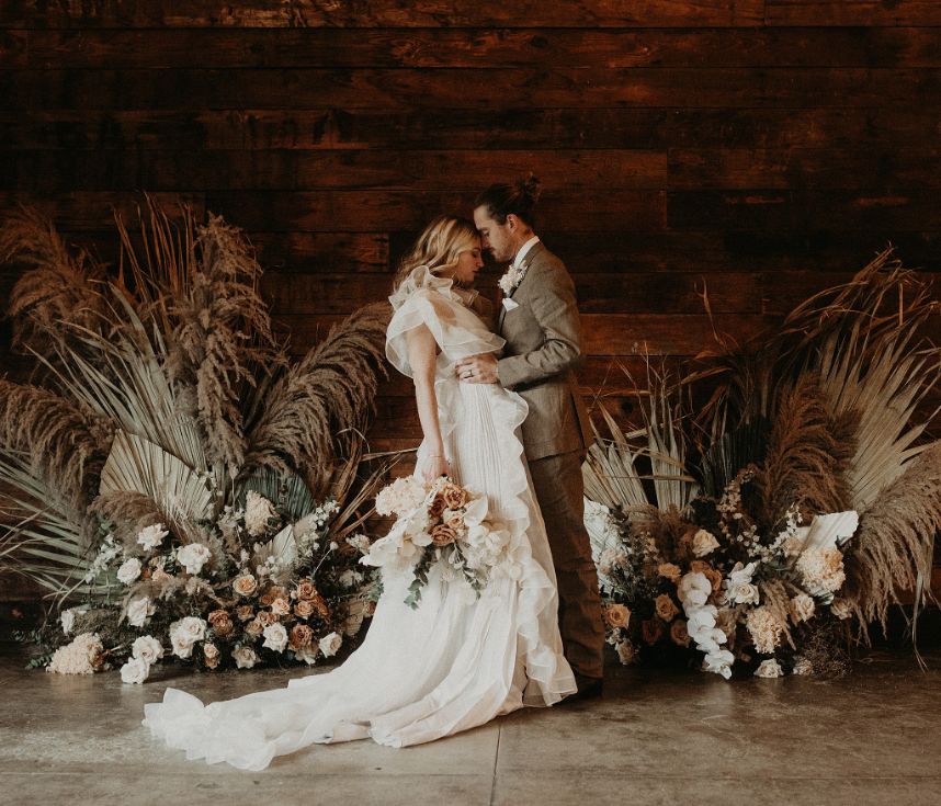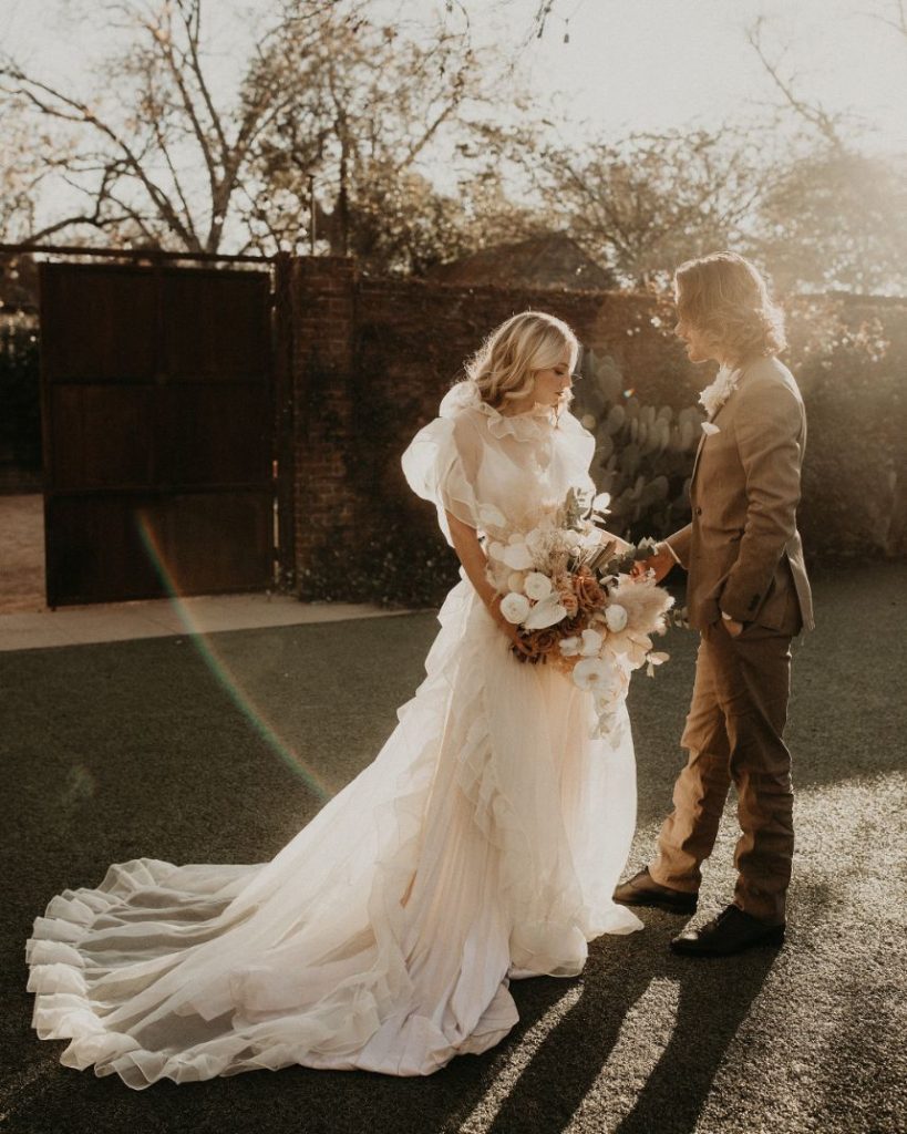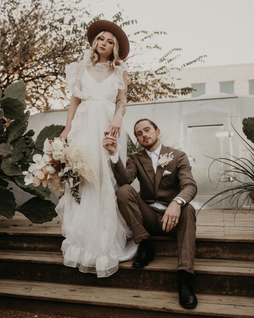 Hidden within Hill Country is where we can always count on finding the most breathtaking of boho inspiration and this styled Austin micro wedding captured by Nikk Nguyen Photo is no exception! This gallery tells the story of wedding scenes where dried design and fresh floral textures combine, while earth tones and muted vintage decor plus a few modern touches really stole the show. A sight for sore eyes is this Unbridaled gown in elegant, airy ruffles and a high-neck design this bride modeled all too well in dramatic weddingscapes around the property. Her ensemble paired with a cognac-colored felt hat was a total bohemian dream! This bride and groom made a perfect match as they posed alongside florals and decor that came together in beautiful and complementary ways. Modernity was brought to this Austin micro wedding with paperie by Owl & Envelope in the form of sage and olive invitation suites, menus, and signage. The juxtaposition of this elegant couple and their details against a setting reminiscent of deserts far away is something truly editorial as pampas, dried palms, Sahara roses and more combine in the most stunning ways. See what’s to obsess over about this Austin micro wedding inspiration in the gorgeous gallery down below. Cheers!