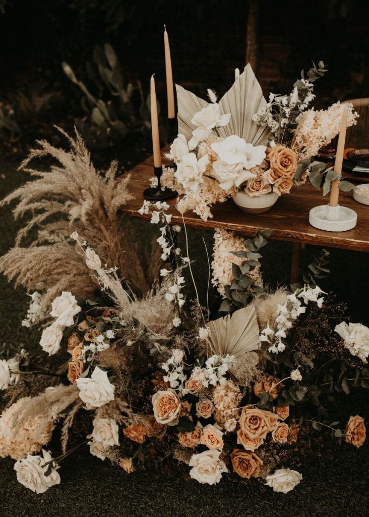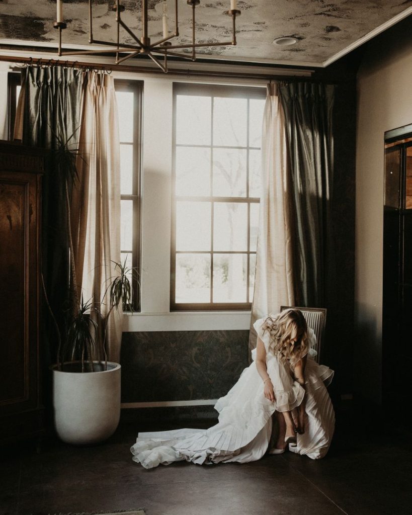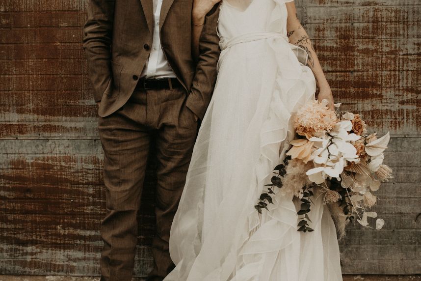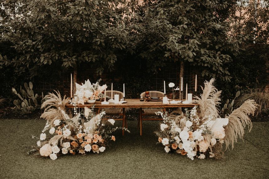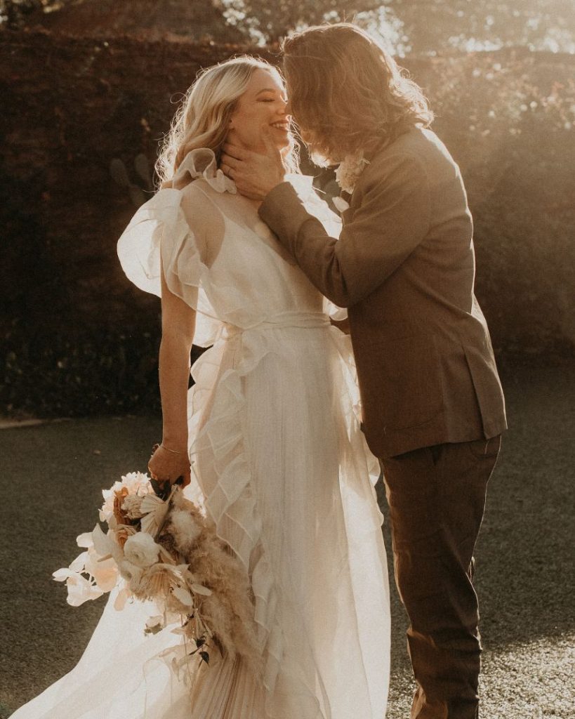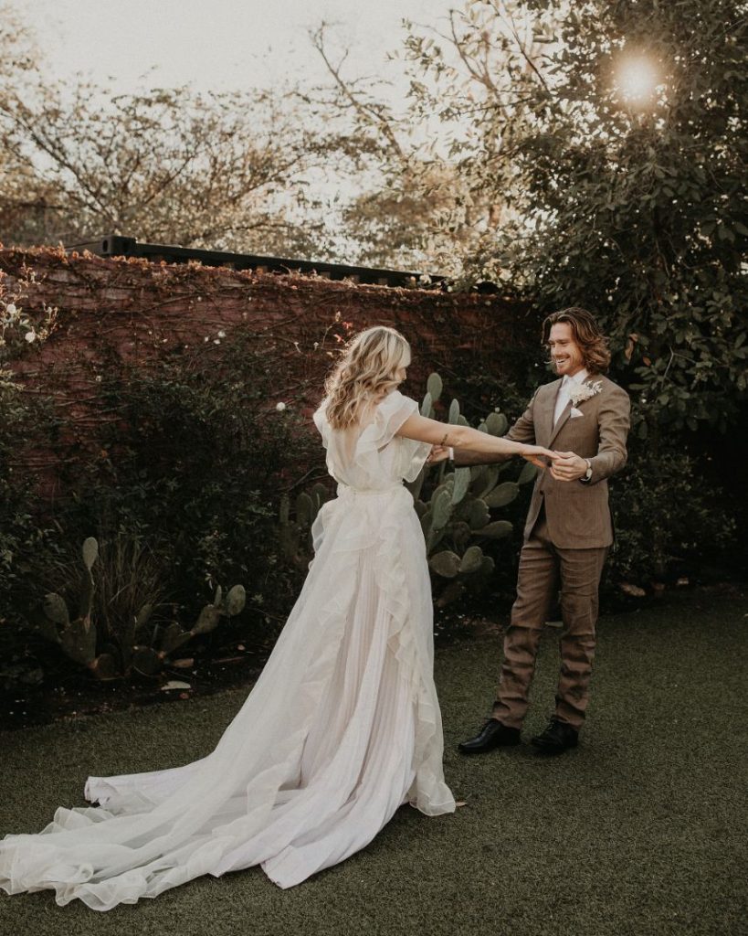 Hidden within Hill Country is where we can always count on finding the most breathtaking of boho inspiration and this styled Austin micro wedding captured by Nikk Nguyen Photo is no exception! This gallery tells the story of wedding scenes where dried design and fresh floral textures combine, while earth tones and muted vintage decor plus a few modern touches really stole the show. A sight for sore eyes is this Unbridaled gown in elegant, airy ruffles and a high-neck design this bride modeled all too well in dramatic weddingscapes around the property. Her ensemble paired with a cognac-colored felt hat was a total bohemian dream! This bride and groom made a perfect match as they posed alongside florals and decor that came together in beautiful and complementary ways. Modernity was brought to this Austin micro wedding with paperie by Owl & Envelope in the form of sage and olive invitation suites, menus, and signage. The juxtaposition of this elegant couple and their details against a setting reminiscent of deserts far away is something truly editorial as pampas, dried palms, Sahara roses and more combine in the most stunning ways. See what’s to obsess over about this Austin micro wedding inspiration in the gorgeous gallery down below. Cheers!