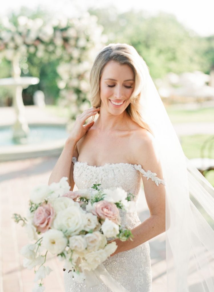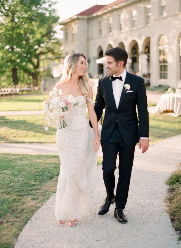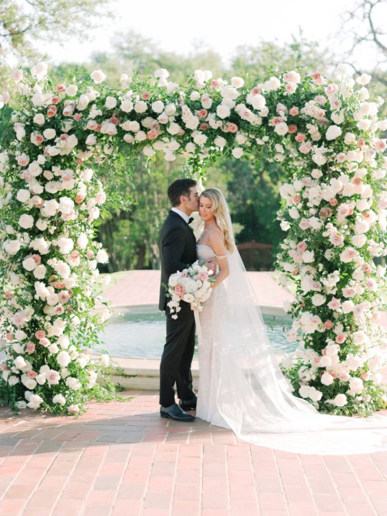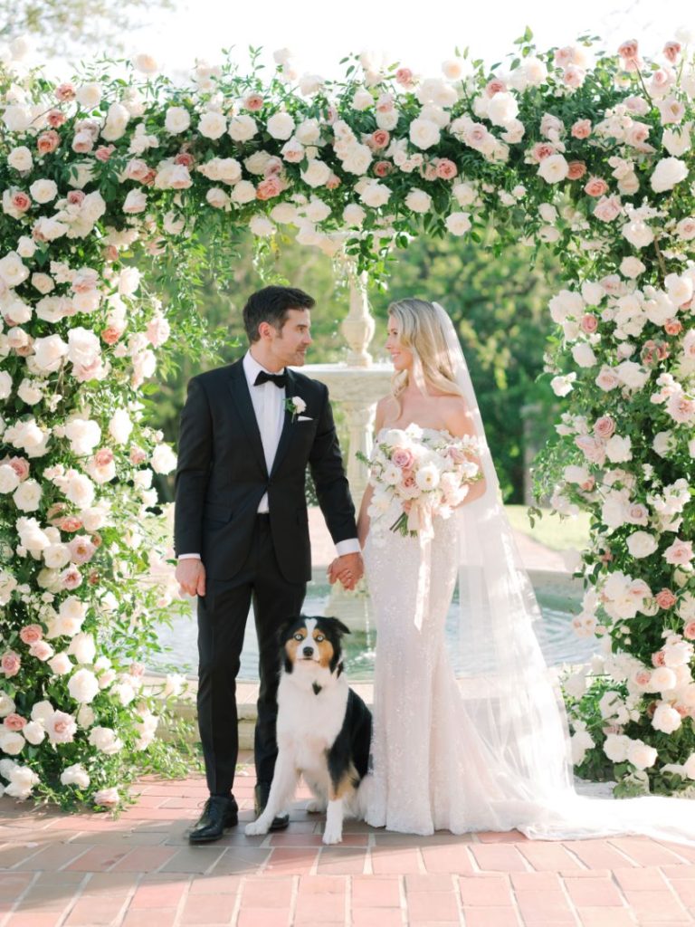 Pop the Dom Pérignon for Jenny and Tyson’s French garden wedding. This lush dreamscape at Commodore Perry Estate brought all the French garden vibes that completely captivated our hearts. The sweet couple met, as Jenny describes, “in true millennial fashion” on Hinge. After one date, the two hit it off, and Jenny became completely smitten by Tyson and his love to travel. Tyson proposed to Jenny on Christmas Eve with the help of the couple’s Australian Shepherd puppy, who wore a bandana that said, “Will you marry me?”. We love any Christmas Eve engagement, especially ones that involve a cute pup! Of course, Jenny said “yes,” and the couple began planning their dream French garden wedding. Jenny and Tyson quietly eloped seven months prior to their big day in Aspen, Colorado. Since Tyson always dreamed of eloping in the mountains, and Jenny had always dreamed of a small and traditional garden wedding, they decided to do both. As a result, they both got the wedding of their dreams! Pearl Events Austin helped Jenny execute her French garden dream with a dusty rose color palette under the Austin sky. It is important to bring attention to the most amazing floral arch with over 1,000 roses from Stems Floral Design + Event Styling. The florals in Jenny and Tyson’s wedding are nothing short of a fairytale. The pink and white rose bundles paired well with the French-inspired decor and rentals from Whim Hospitality. Sophie Epton Photography captured all the light, love, and French elegance in Jenny and Tyson’s special day. Keep scrolling to see more of this French garden wedding and a special note from the bride!