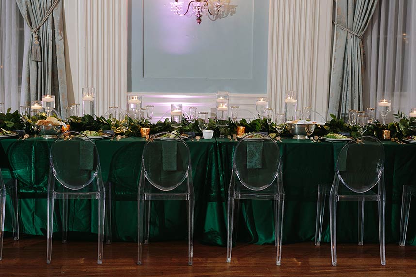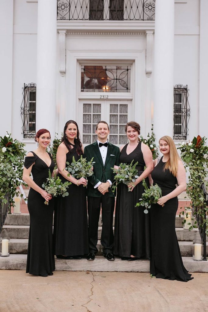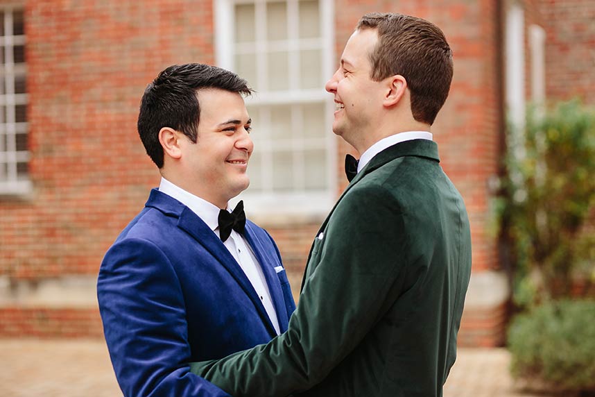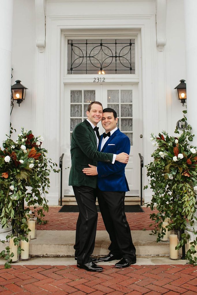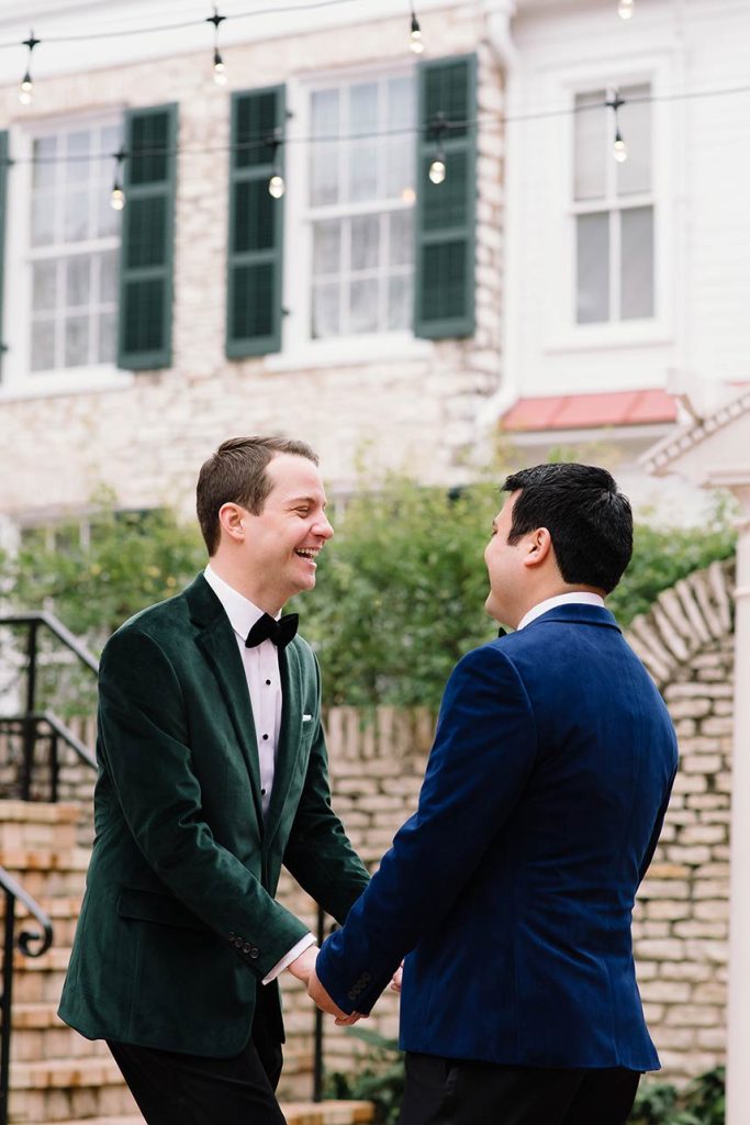 Andrew and Trace met through mutual friends in October 2010. Knowing now how different their personalities are, they look back and laugh when they talk about the first time they met at a dive bar’s karaoke night. At the time, Trace was still enjoying the college lifestyle, and Andrew was beginning his career as a young professional. Their mutual love of horror movies took their relationship from casual hangouts to official dating status. Many karaoke outings and movie nights later, Andrew finally agreed to make things official with Trace on April 11, 2011. After years filled with steak dinners and bottles of wine, TV binge nights and film festivals — and a growing love — the couple developed an unshakeable bond. Trace proposed to Andrew on January 31, 2016. Trace and Andrew decided to tie the knot at The Mansion. Located in the West Campus neighborhood of the University of Texas in Austin, the venue provided the perfect space for this couple to celebrate their union and highlight their unique and spirited wedding. They even welcomed their dog, Coach McGuirk, as the ring bearer!