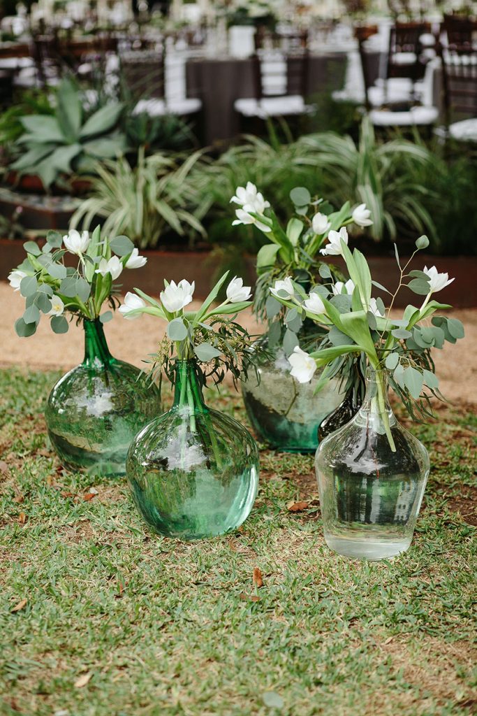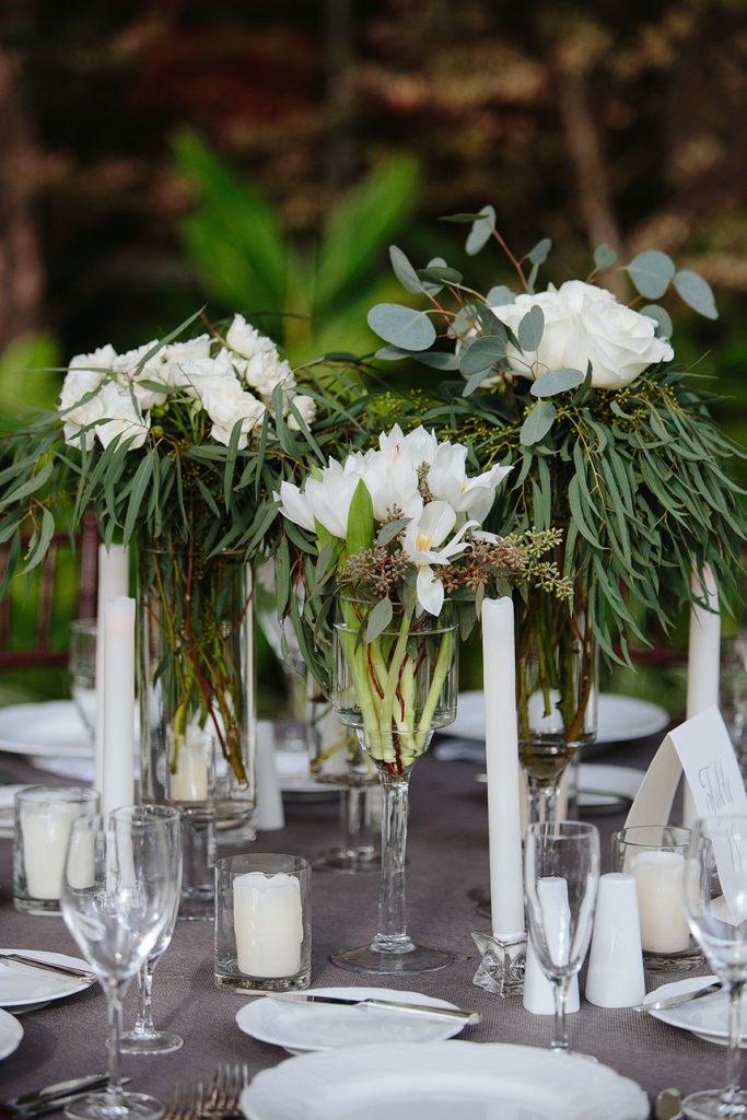 That evening, 250 friends and family took their seats to witness the marriage of Liz and Jason. The bridesmaids wore long neutral colored gowns that looked sophisticated and understated against the rich emerald greenery. The groomsmen wore classic dark tuxedos and bowties. The bride wore an elegant strapless Monique Lhuillier embroidered gown in ivory with a sweetheart neckline and sweeping train. Her fiery red hair beautifully flowed over her shoulders in soft curls.