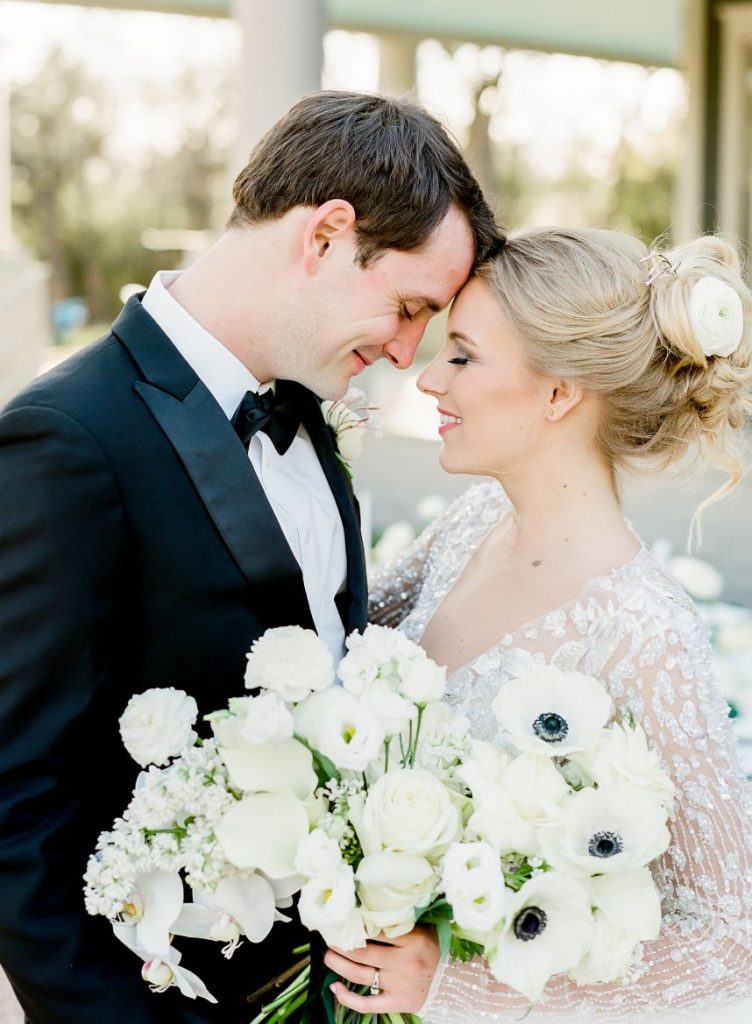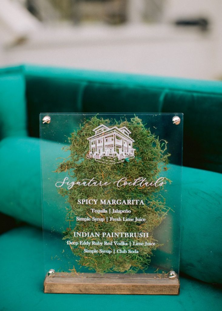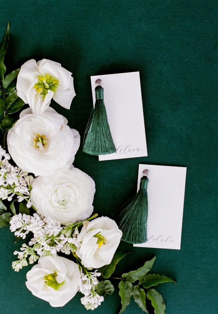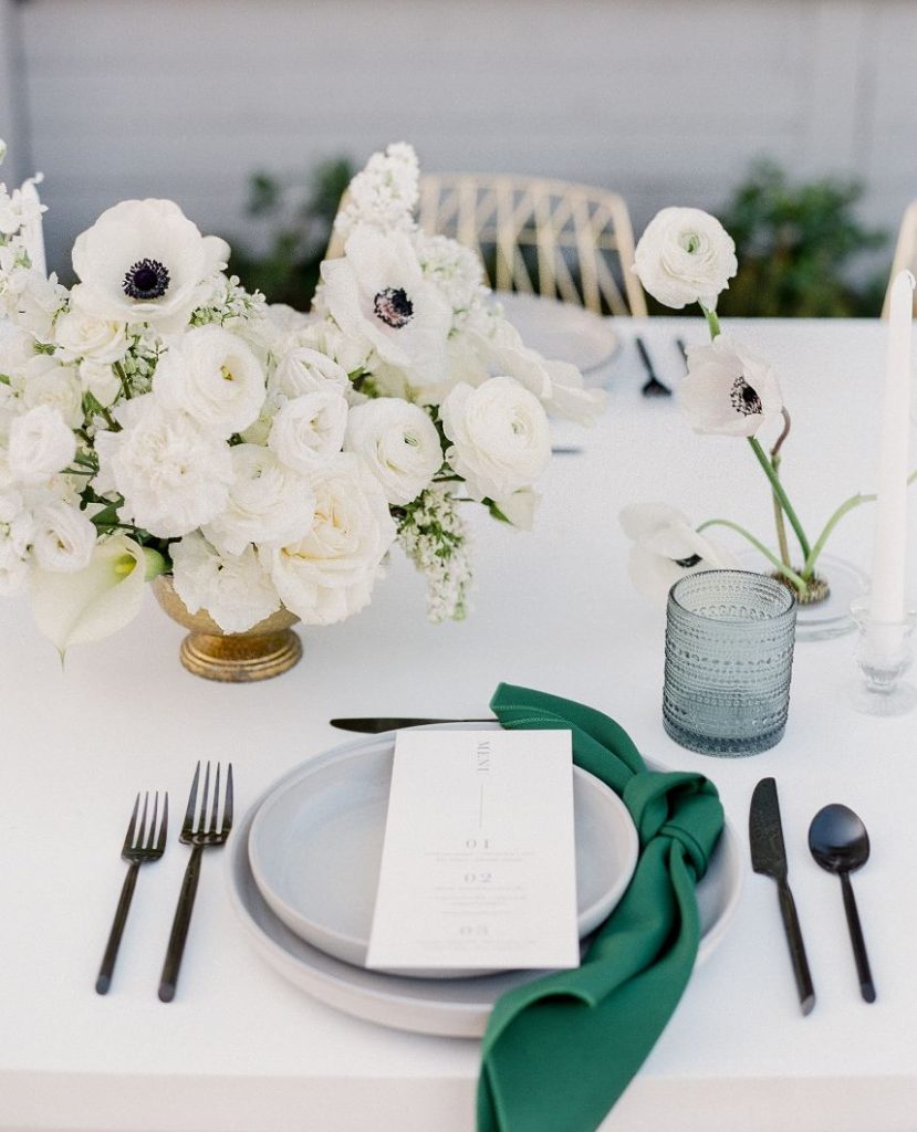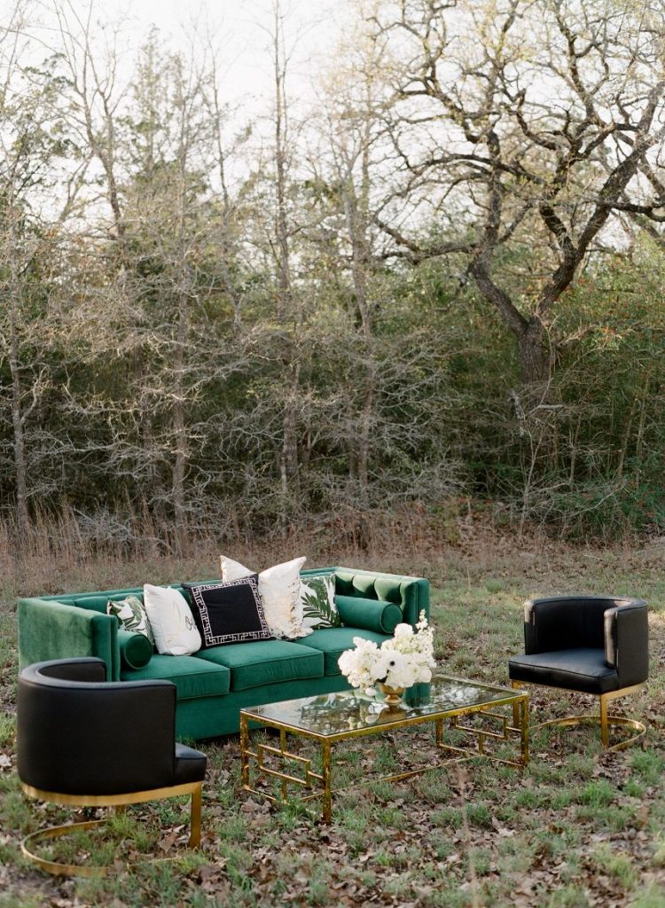A wraparound front porch, stately columns and a manicured mansion lawn set the stage for this eye-catching Emerald Estate editorial illustrating pure elegance at a charming historical Austin wedding venue, planned and executed beautifully by Eclipse Event Co.! The Grand Lady served as the venue and backdrop for this editorial, which you can see in its entirety in the latest Brides of Austin issue! Wanting to show how a vintage, Hill Country venue can still be the perfect place to host a truly elegant, black-tie affair, the ladies at Eclipse Event Co. chose each element carefully to create a cohesive, formal look. The Bloom Bar‘s incredible florals helped achieve the formal vibes with anemones and an array of white blooms offering a sleek, monochromatic look. An intimate dinner party awaits with the lounge area and table from Zen Event Rentals, topped with chic linens and dinnerware from Marquee Event Rentals – what a duo! Deep emerald green, pops of gold and a sea of white all work seamlessly to form a magical, elegant affair at this historical Austin wedding venue, and we are enamored to say the least!