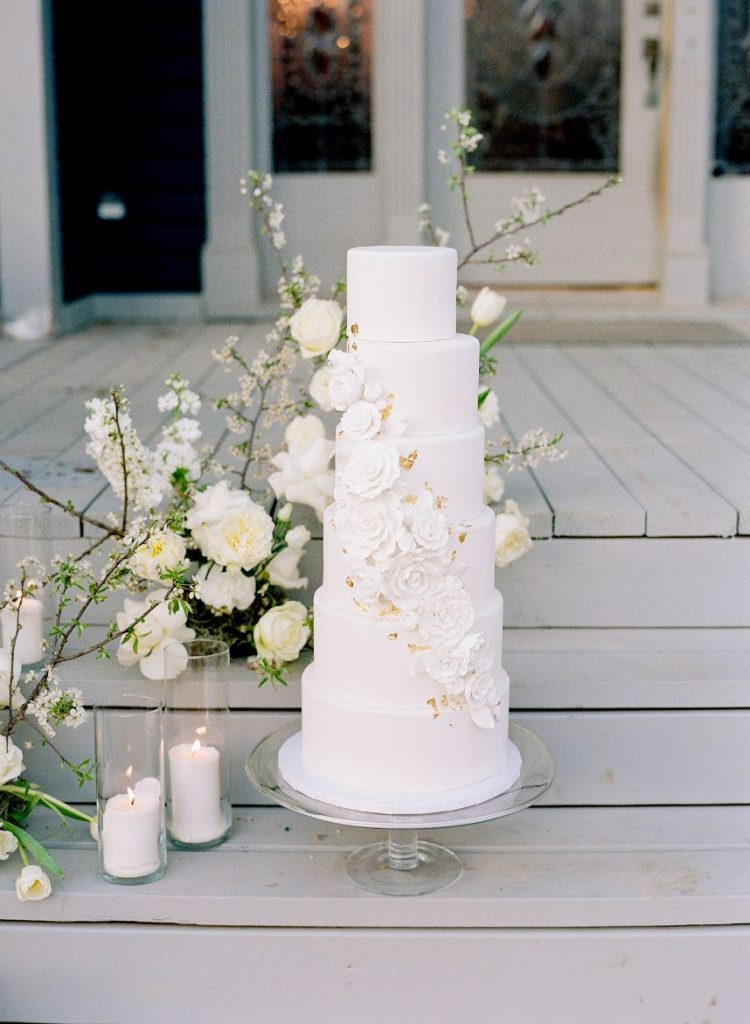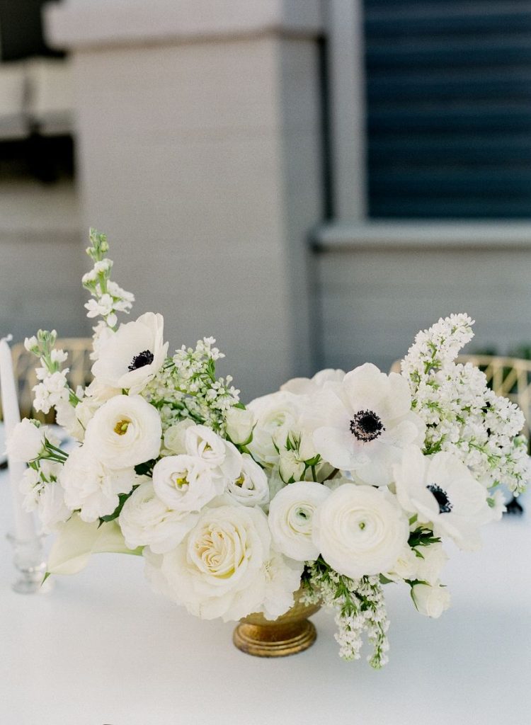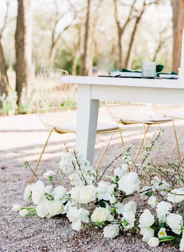 From the florist, The Bloom Bar: “For this shoot, I really wanted to play up the dimensional white textures and the clean look of no greenery. One of my favorite touches were the blooming branches that added a wispy and ethereal look. I designed the ceremony backdrop to double as an accent around the dining table.”