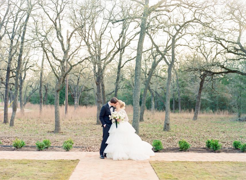 From the planners, Kristi Depew and Lauren Chumbley of Eclipse Event Co.: “With this design, we wanted a more modern, black tie formal look. The monochromatic plateware settings helped the greens and golds pop even more against the white table. The idea was to show how even a venue with vintage nods in the Hill Country can still be an elegant affair!”