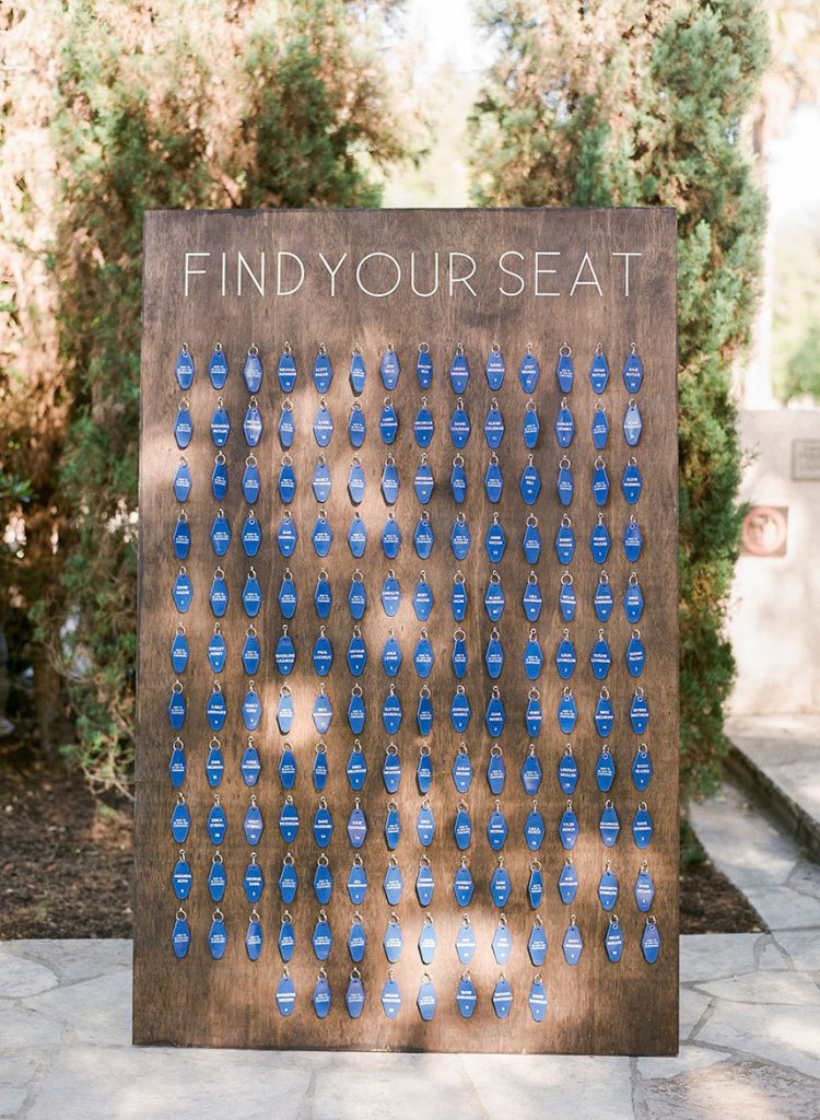 “For cocktail hour, The Waters band played a Fleetwood Mac cover set, wrapping up with the couple’s favorite song ‘Everywhere’ as they were introduced. To thread that theme through the guest experience, we worked with Averi with an Eye to create a custom guest seating display made up of keychains with the lyric ‘want to be with you everywhere’ a nod to their favorite Fleetwood Mac song and a play on keeping your keys with you!”
