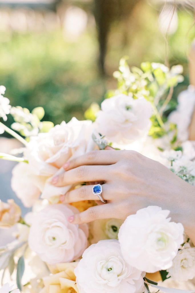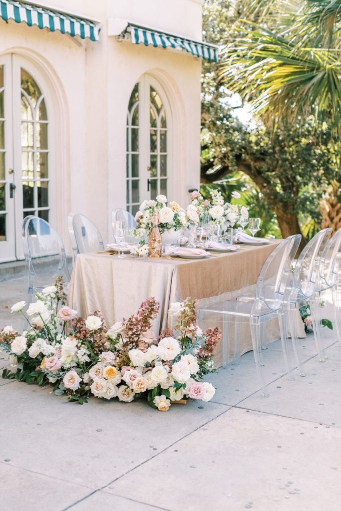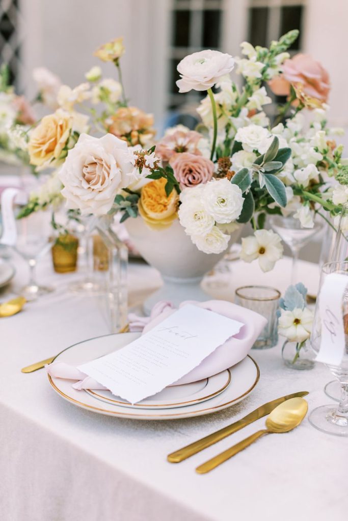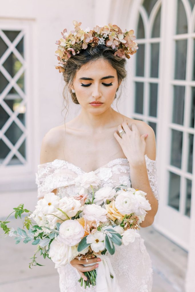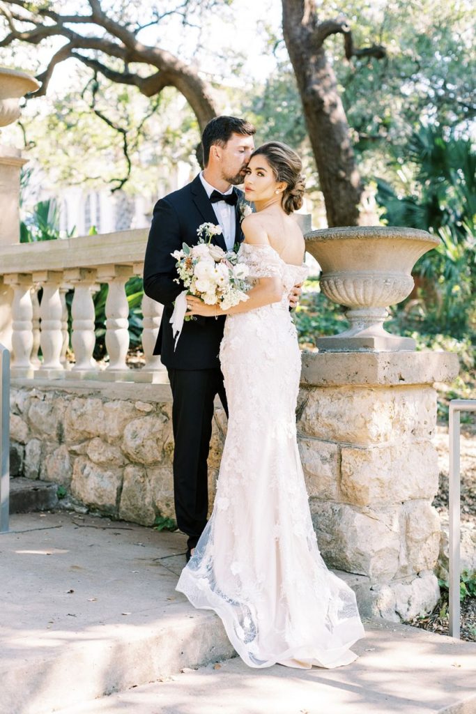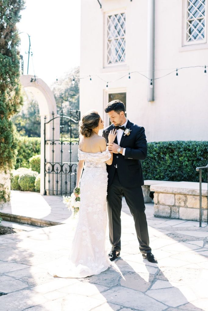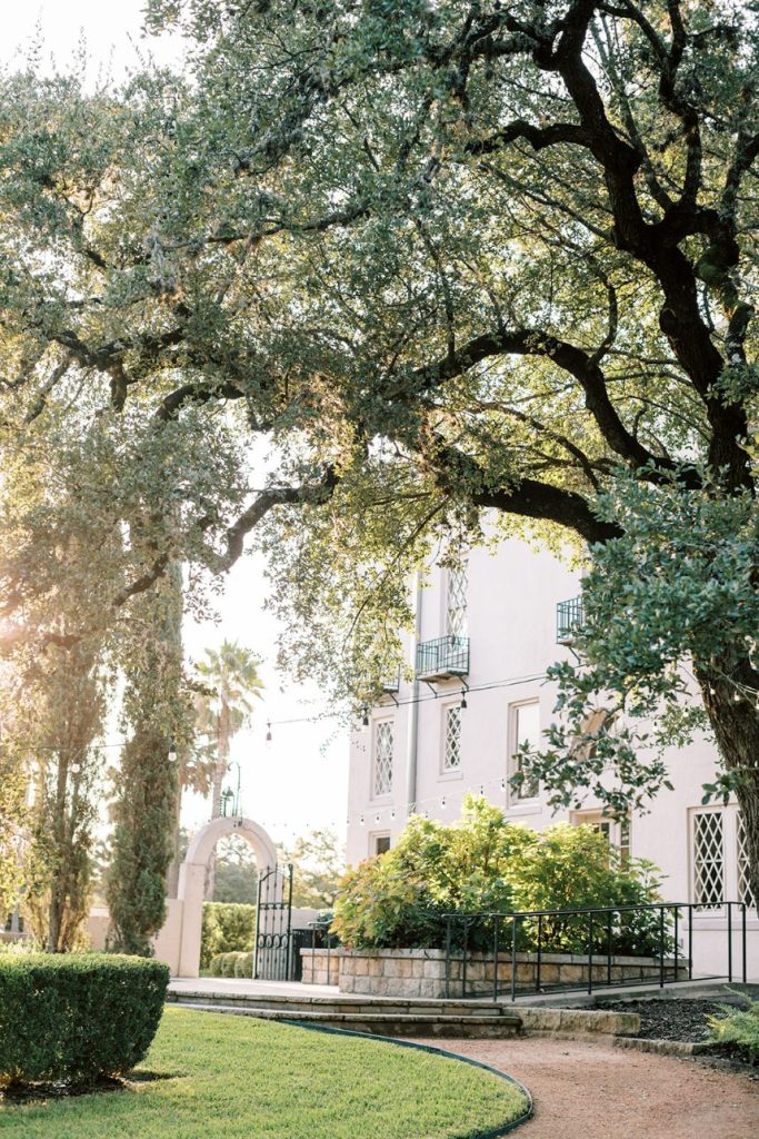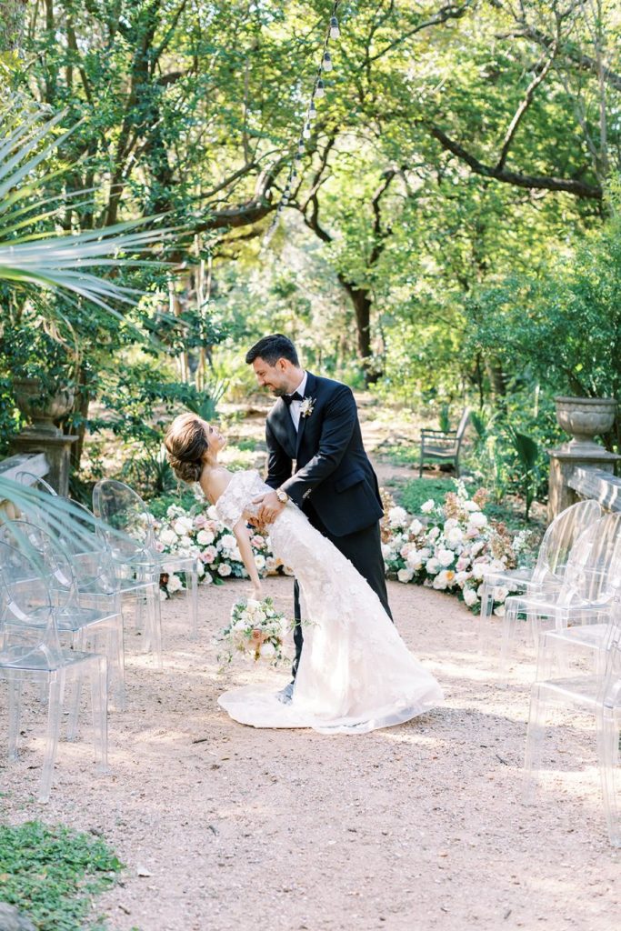 This styled wedding inspiration is absolutely full of European romance! Captured in classic light and airy style by The Crakes, this styled shoot showcases a romantic forest altar scene as well as an amazing al fresco tablescape for wedding scenes that will steal your heart – right here in Austin! Say “I do” amid the lush green tropical paradise of The Contemporary Austin – Laguna Gloria surrounded by elegant pale pink and ivory blooms with pops of peach accents. This mod ceremony setup feels so organic and effortless, yet totally special and put-together at the same time. Our darling bride model looks like she stepped out of a fairytale, styled with a natural, terra cotta-toned makeup look and full, mauve pout as well as a traditionally elegant updo by Think Brink Beauty, while rocking an asscher cut sapphire from Nicole Mera in a stunning halo setting, and in a second look, a round brilliant diamond engagement ring paired with a hammered yellow gold band. Swoon! Turning attention back to the European-inspired outdoor seating, both palette and décor details steal the show. Acrylic ghost chairs from Marquee Event Rentals set at a luxe velvet tablescape is possibly the most inviting and upscale al fresco reception seating can look all at once, characterized by its muted pastel palette and timeless textures for the most classic combinations of elements. Read on for a note from the photographer about the vision behind this shoot and its planning and design, pulling major inspiration from scenic European cities. Cheers!