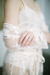 No! The goal of boudoir photography is for you to feel like your sexiest self, no matter what that means for you. In boudoir, nudity is often implied but rarely shown. Your bridal veil, a silky robe, some lingerie or even some of your partner’s clothing can all work as perfect ensembles for your first wedding boudoir session. Feel free to get creative with what you wear to cover up as little or as much as you’d like. Your flower bouquet, accessories, and bridal shoes can also add an extra touch of personalization to photos. Additionally, open communication between both parties can help determine how heavily your photographer plans to retouch any problem areas of your photos, if at all.