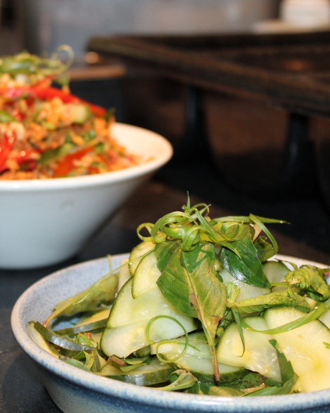 Thistlewood Manor’s catering delights with a flavorful appetizer featuring fresh cherry tomatoes, crisp asparagus, and vibrant pesto, and they also offer off-site catering to bring their delicious offerings to your event location.