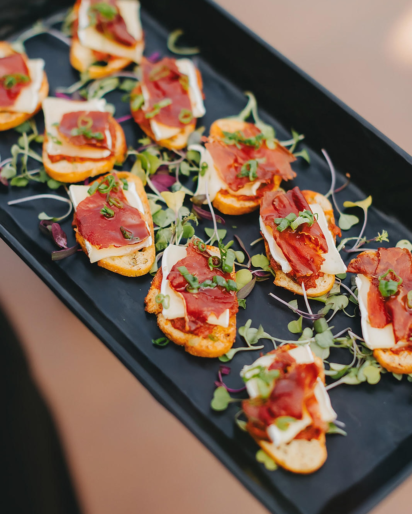PEJ Events knows how to elevate flavors with their mouthwatering creation: roasted tomato jam, torched brie, and crispy prosciutto. A perfect blend of sweet, savory, and smoky!