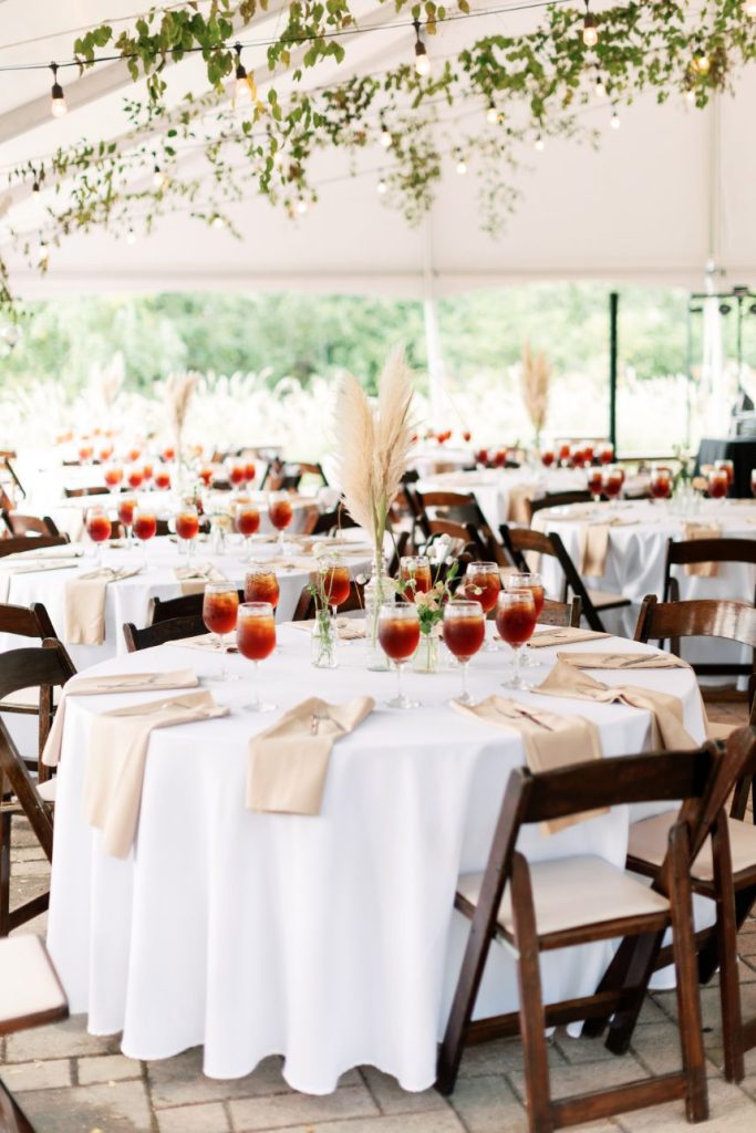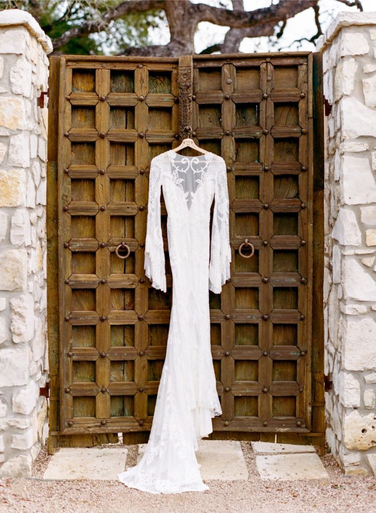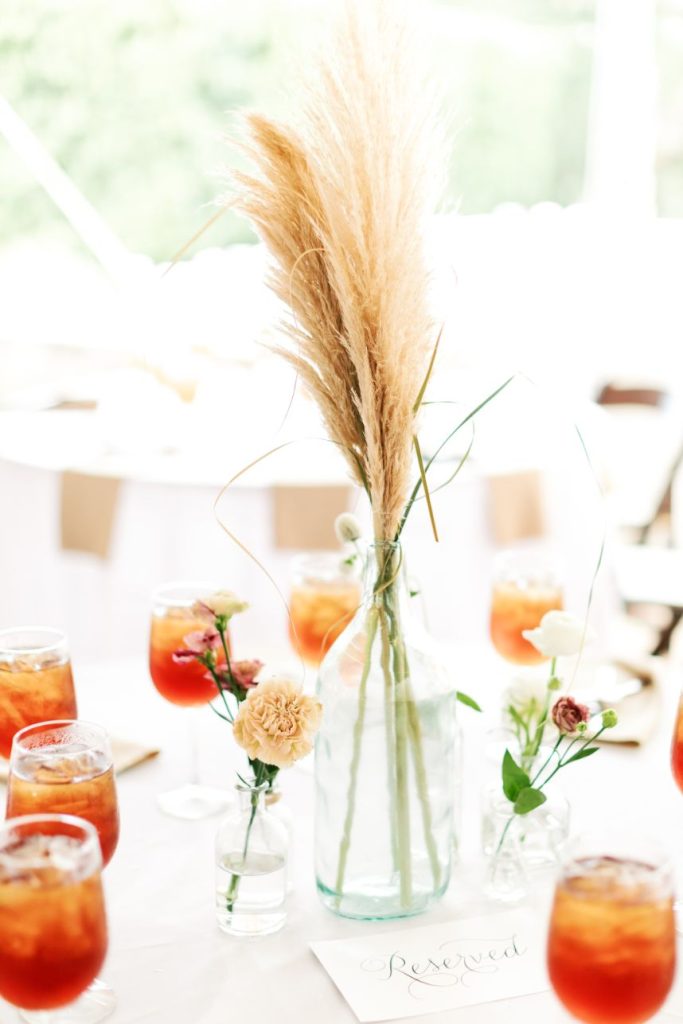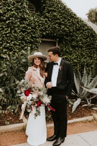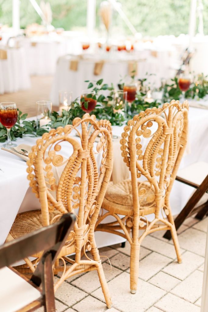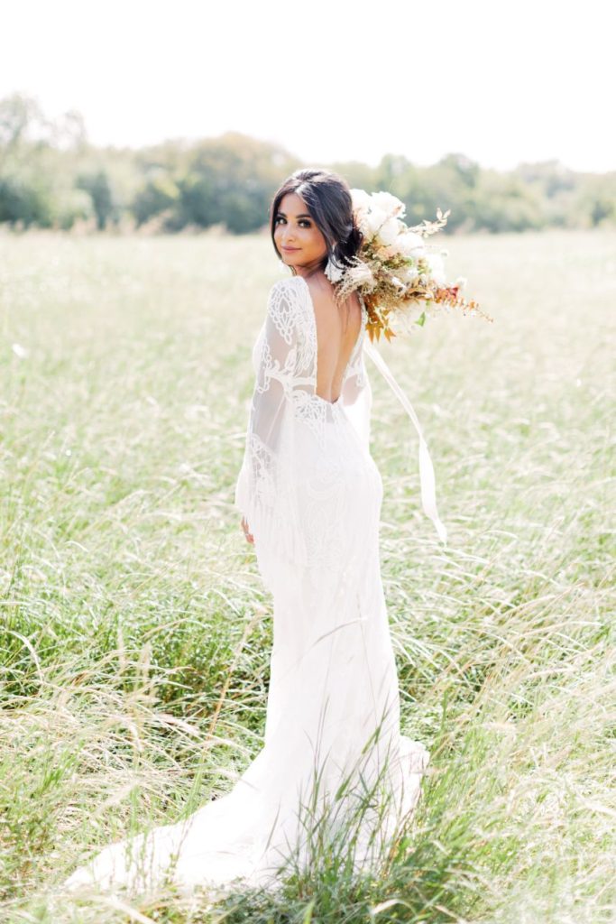 Jocelyn and Kaleb’s boho-chic wedding has all of us ready to say “I do.” Bride Jocelyn’s gorgeous bell-sleeve gown features a beautiful, flowing skirt, an open back, and a boat neckline with sheer mesh panel and appliqué floral designs all over – a stunning choice for a fall soiree, and easily the centerpiece of this incredible wedding celebration. With this wedding’s warm, organic palette, it’s easy to mix and match a variety of different textures and finishes — wood and wicker pair perfectly with pampas grass, fresh greenery and bohemian textiles. We love seeing earth tones in every corner, all captured by the oh-so-talented duo behind Feather & Twine. Cheers to Jocelyn and Kaleb!