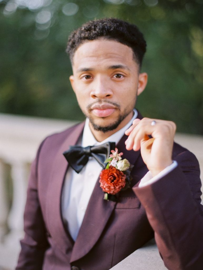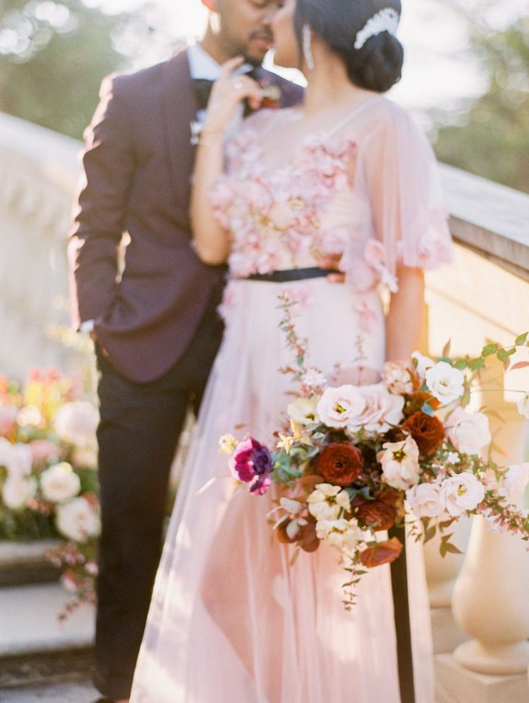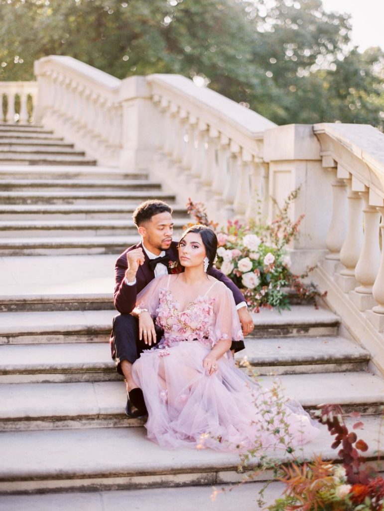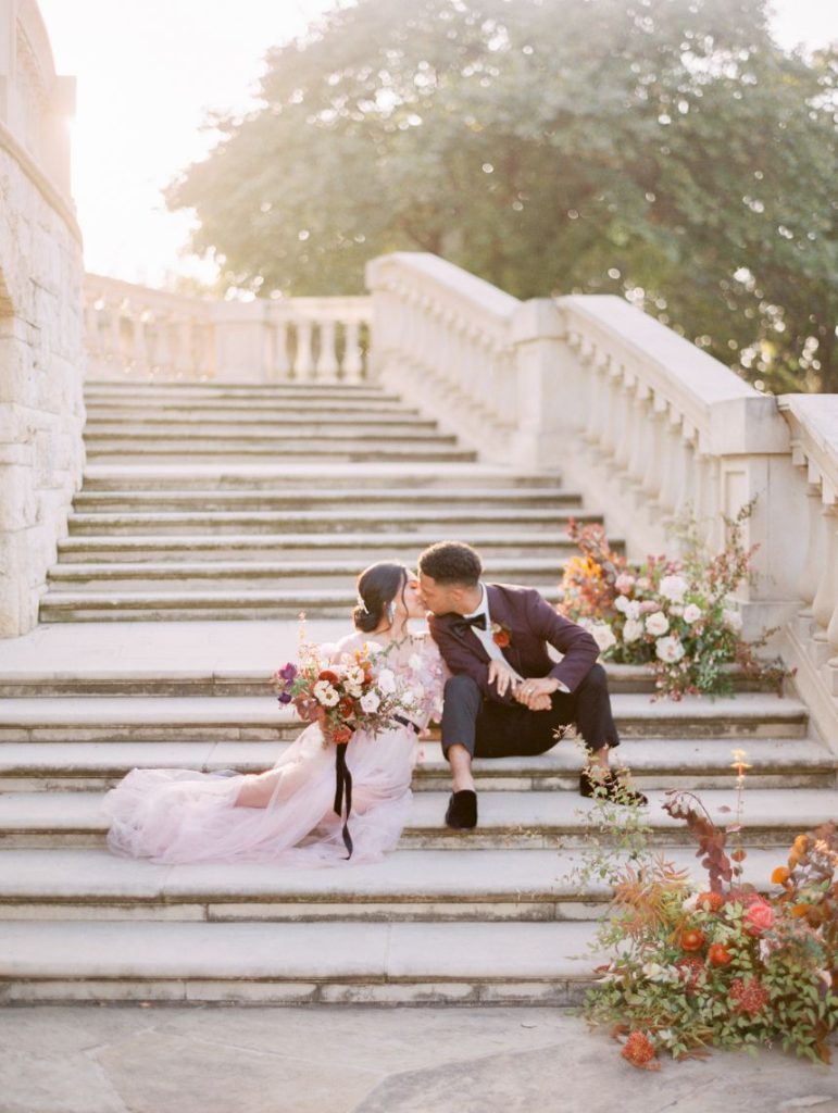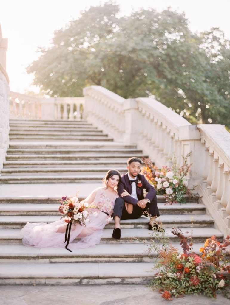 From the planner, Lauren Field Design: “An intimate elopement editorial set amongst the European grandeur of The Olana, inspired by the fading shades of sunset in the fall. Tones of mauve, shades of plum, ochre and golden ivory are surrounded by manicured greenery and sculptural stone. Natural textures are layered alongside feminine accents to create a romantic ambiance full of chic luxe. Olive Grove Design created floral pieces for the ceremony with textured foliage reminiscent of the range of colors seen during the changing of the seasons. The bouquet was a lovely organic shape with blush, rust, and aubergine blooms. The beauty of the venue is its unique European architecture with sprawling landscape, so we knew we wanted to incorporate portraits on the cascading stone stairs and the fountain. The bride wore a stunning embellished tulle gown by Millia London with a chic black belt and sculptural floral earring and mother of pearl headpiece by Hushed Commotion. The groom donned a plum tux with black velvet loafers.”