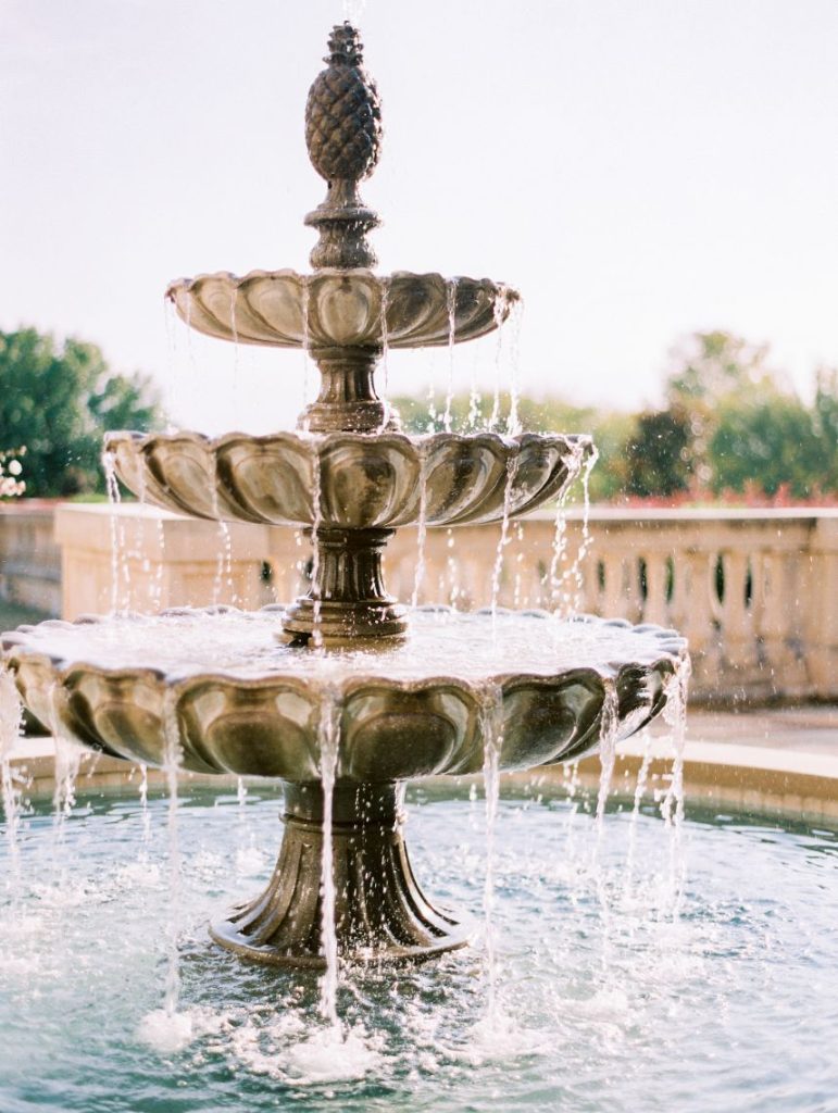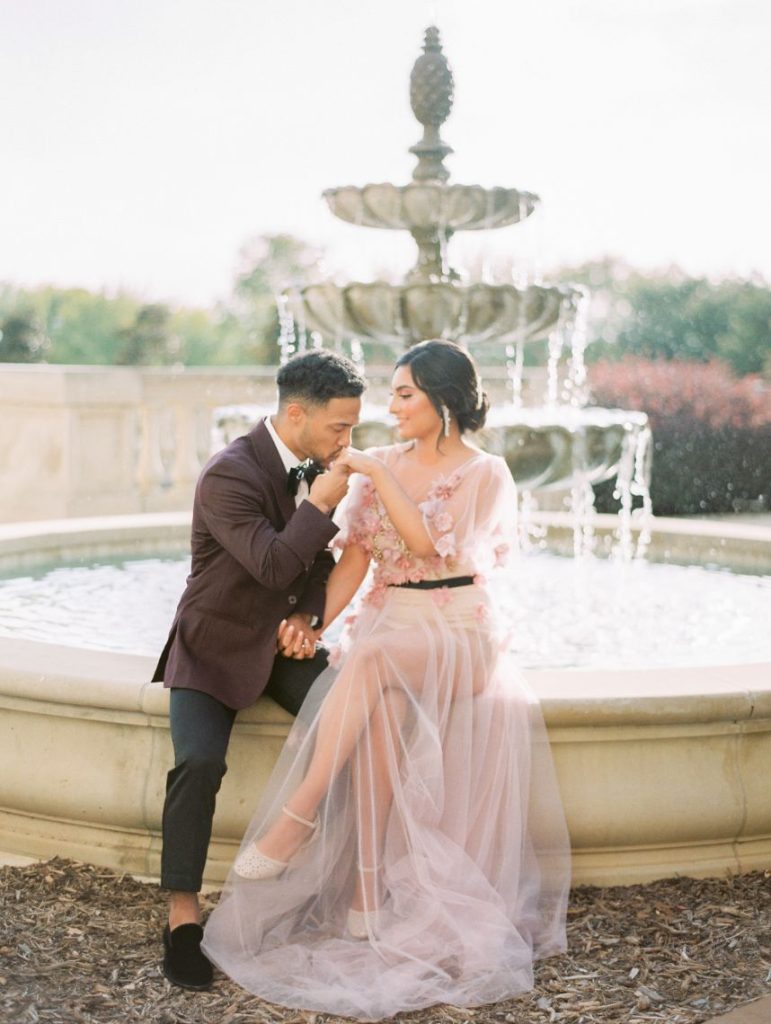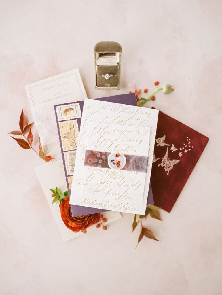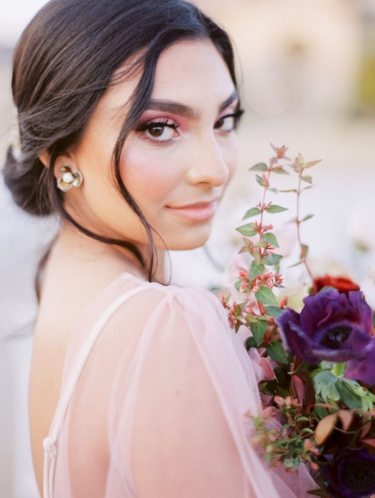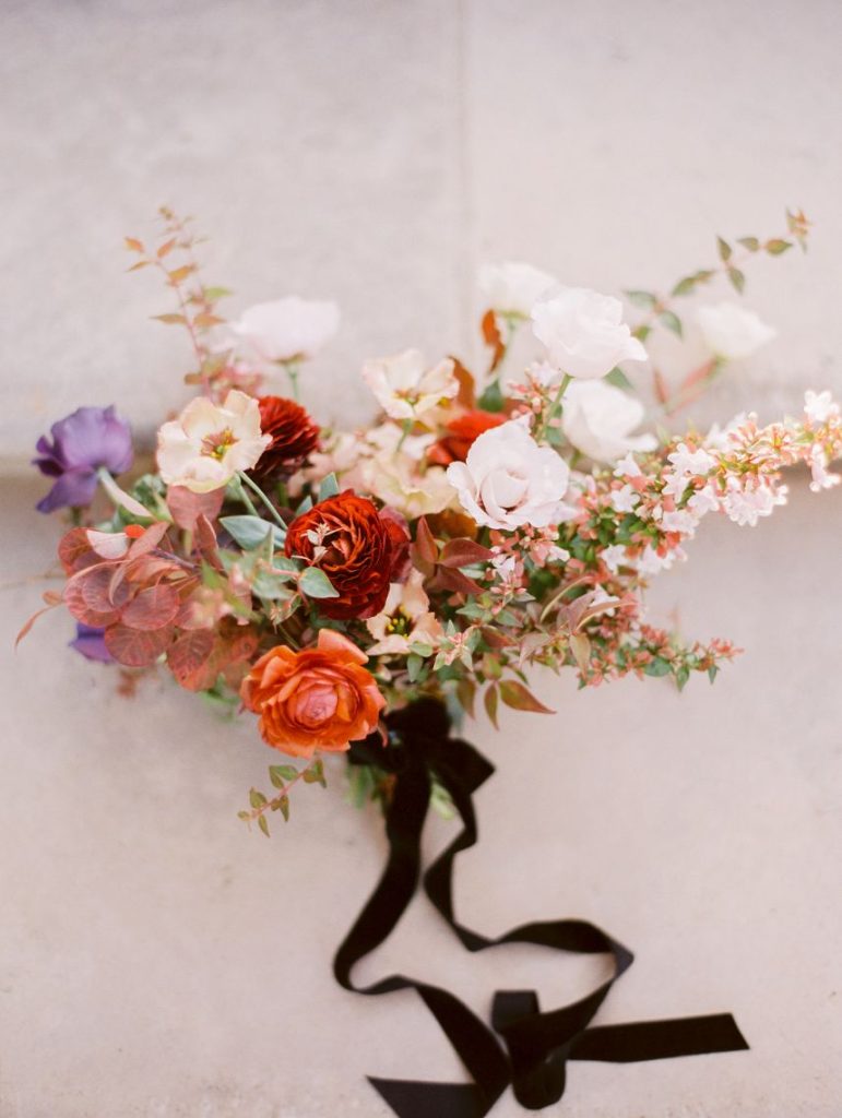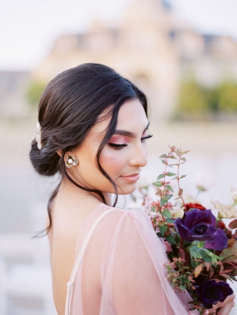 From the planner, Lauren Field Design: “An intimate elopement editorial set amongst the European grandeur of The Olana, inspired by the fading shades of sunset in the fall. Tones of mauve, shades of plum, ochre and golden ivory are surrounded by manicured greenery and sculptural stone. Natural textures are layered alongside feminine accents to create a romantic ambiance full of chic luxe. Olive Grove Design created floral pieces for the ceremony with textured foliage reminiscent of the range of colors seen during the changing of the seasons. The bouquet was a lovely organic shape with blush, rust, and aubergine blooms. The beauty of the venue is its unique European architecture with sprawling landscape, so we knew we wanted to incorporate portraits on the cascading stone stairs and the fountain. The bride wore a stunning embellished tulle gown by Millia London with a chic black belt and sculptural floral earring and mother of pearl headpiece by Hushed Commotion. The groom donned a plum tux with black velvet loafers.”